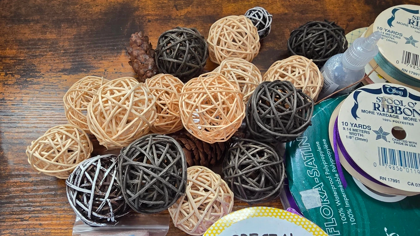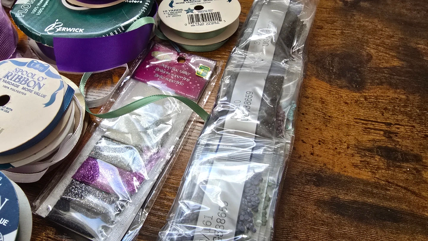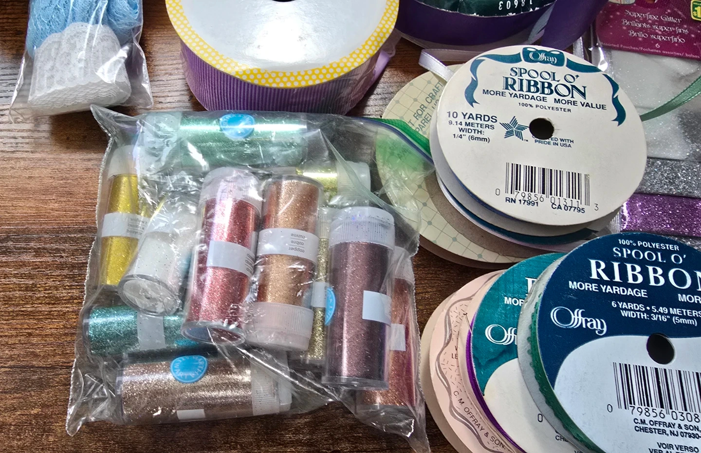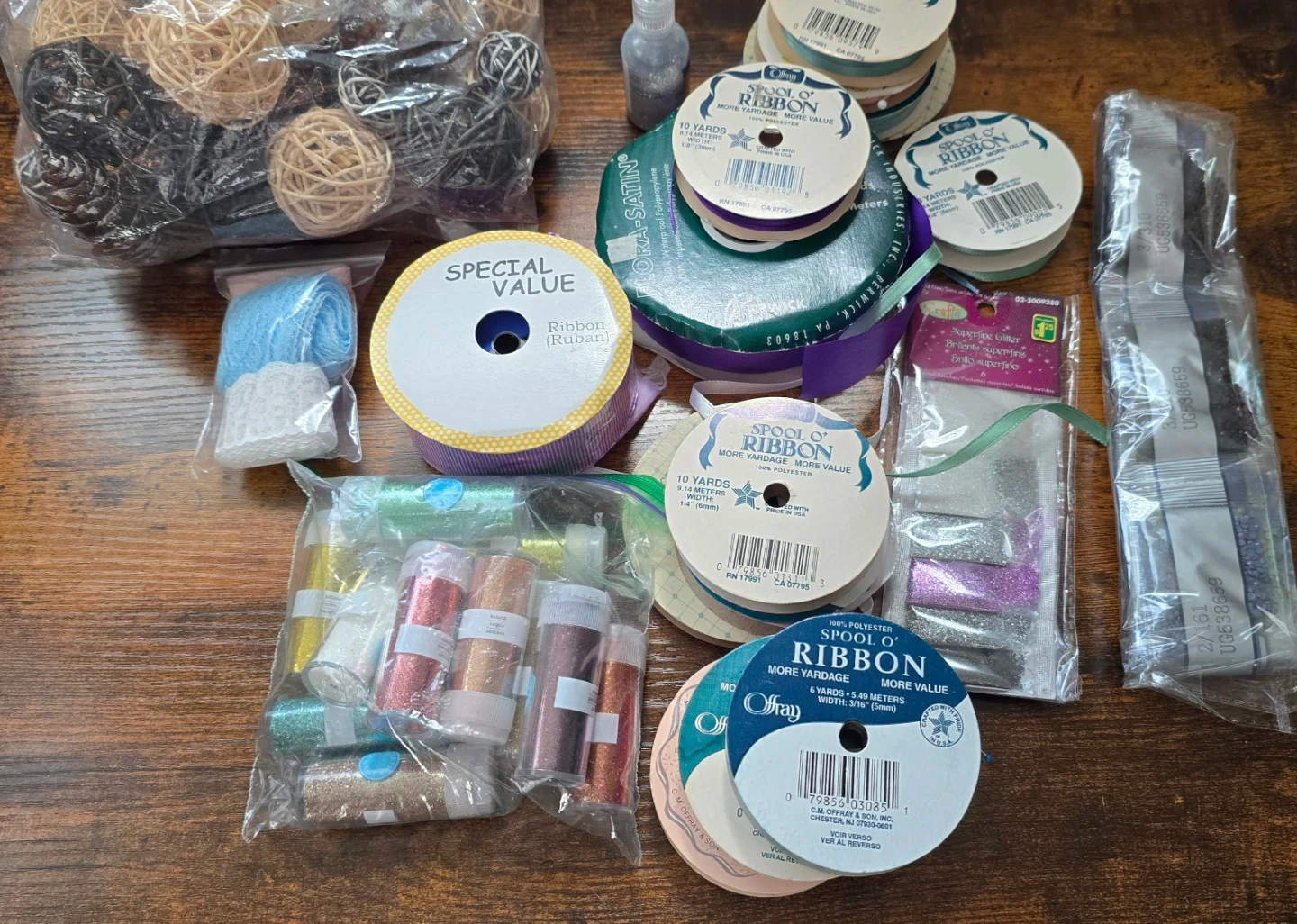 Craft supplies bundle featuring various ribbons and glitter tubes. Ribbons come on spools, some with "Spool O' Ribbon" branding. Includes glitter in assorted colours and textures. Perfect for various crafting projects!
