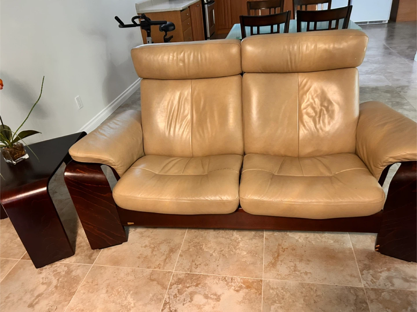 Classic tan leather sofa with curved wood accents. Comfortable two-seater design with adjustable headrests. It's a stylish piece for any living space.