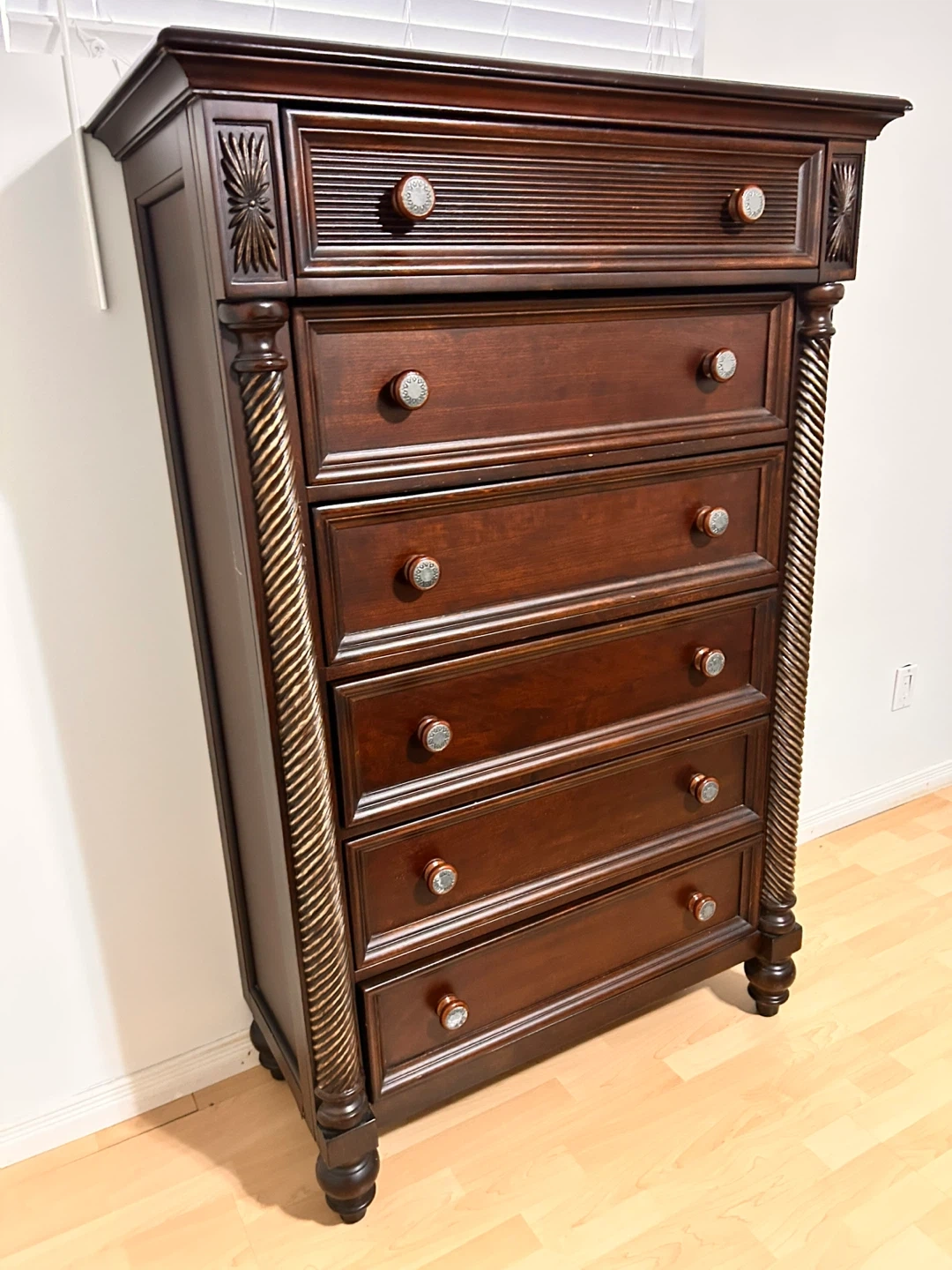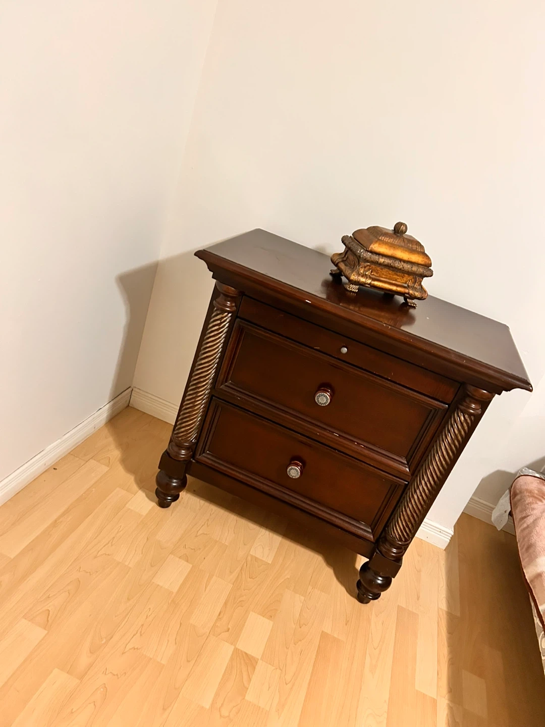 Dark wood dresser with six drawers and a matching nightstand with two drawers. Features ornate carved details and metal hardware. Perfect for bedroom storage!