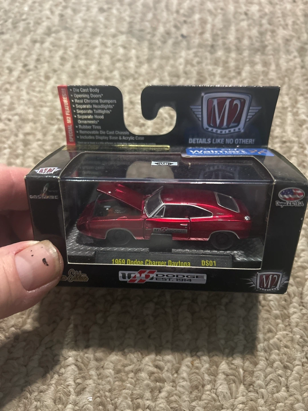 This is a M2 Machines 1969 Dodge Charger Daytona die cast car. It's a limited production world wide item, limited to 5,000 pieces. It features a die cast body, opening doors, separate bumpers, separate headlights, separate taillights, separate hood ornaments, and rubber tires. It also includes a removable die cast chassis and a display base and acrylic case. This car is 1 of 5000 produced!