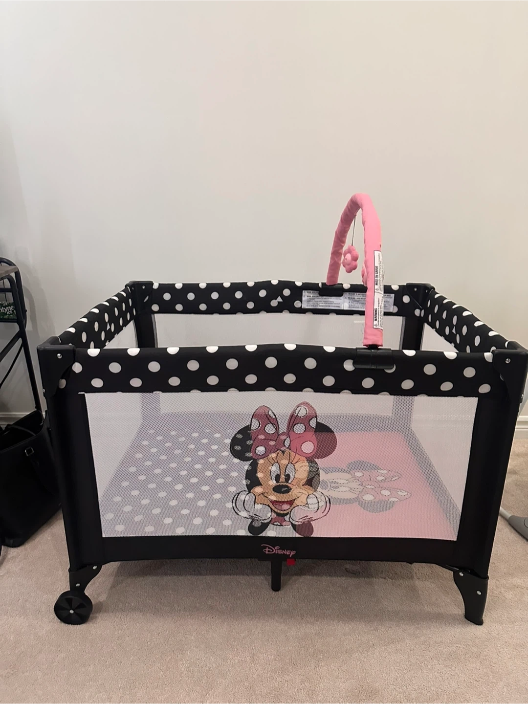 Full price 135, pay 90 - almost brand new. A black and white polka dot playpen featuring Minnie Mouse. It includes a removable mobile with plush toys.
