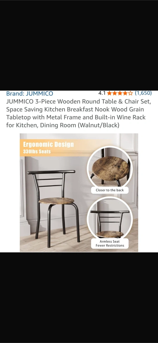 Brand new 3-piece dining set includes a round table and two chairs. It's constructed with a wood grain tabletop and a metal frame. The table features a built-in wine rack for convenience. The chairs have armless seats for fewer restrictions. This compact set is perfect for small kitchens or dining areas.