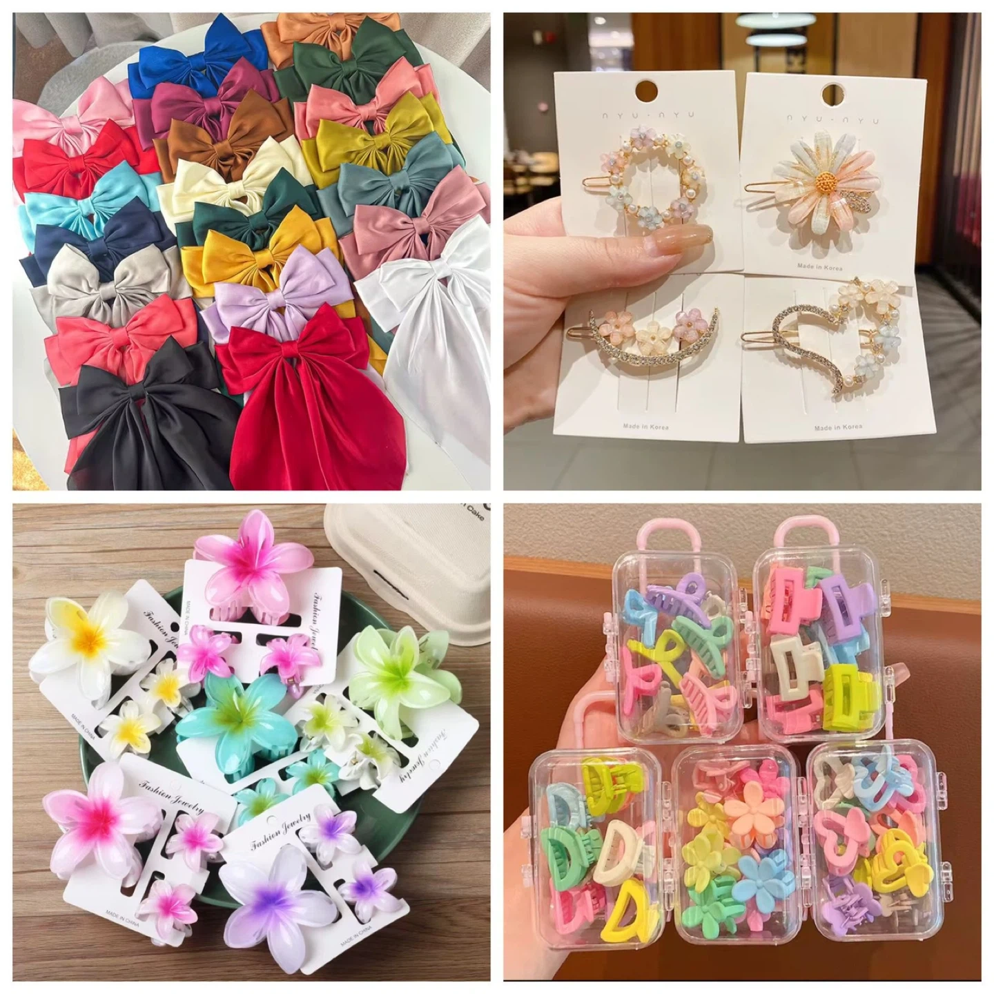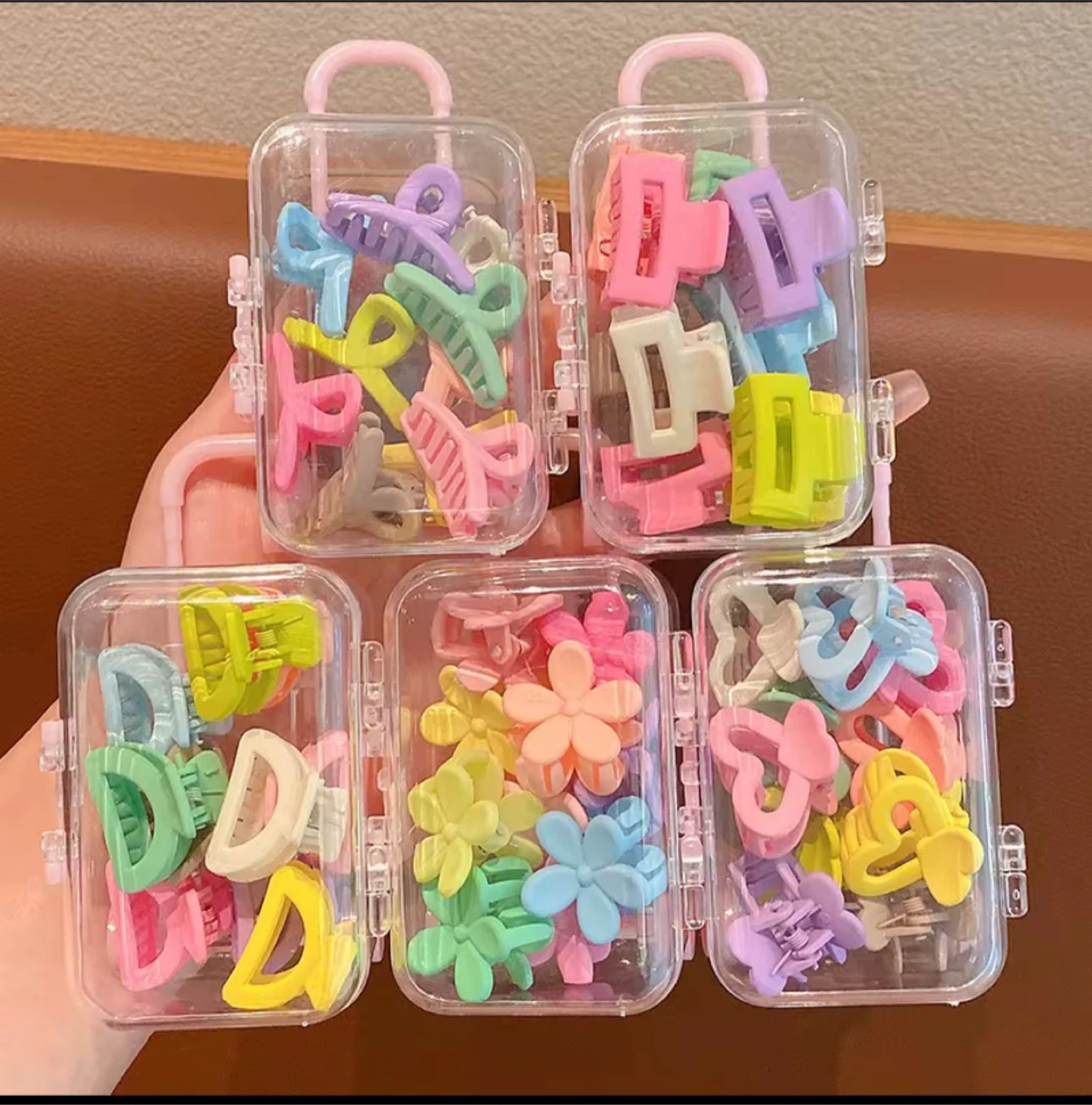 A collection of adorable mini hair clips in various colours and shapes, including flowers and bows. They come in cute, small suitcase-shaped containers, perfect for organizing your little one's accessories. These clips are great for everyday wear and for styling cute hairstyles!