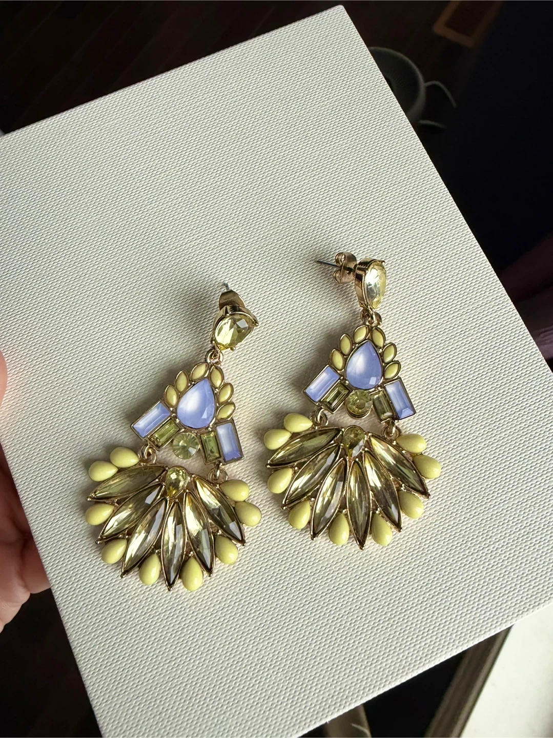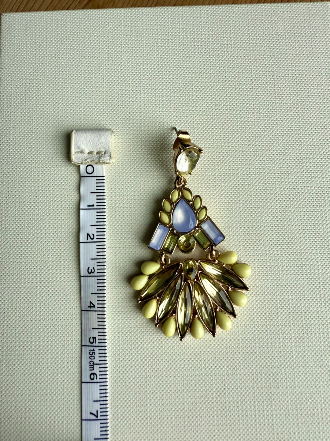 These eye-catching statement earrings feature a fan design with a mix of blue and yellow baguette and teardrop-shaped gems. They're crafted with a gold-tone metal setting. The earrings hang approximately 5cm.They'd be a fun addition to any outfit!