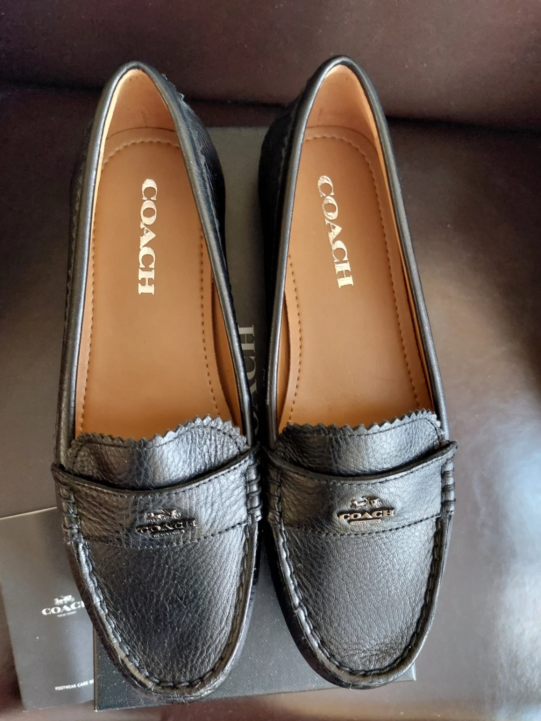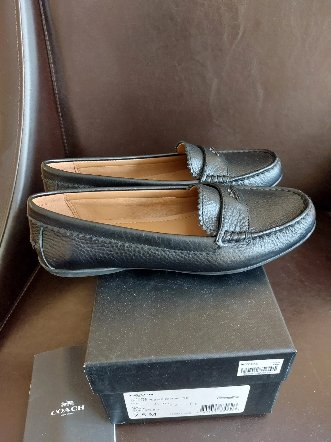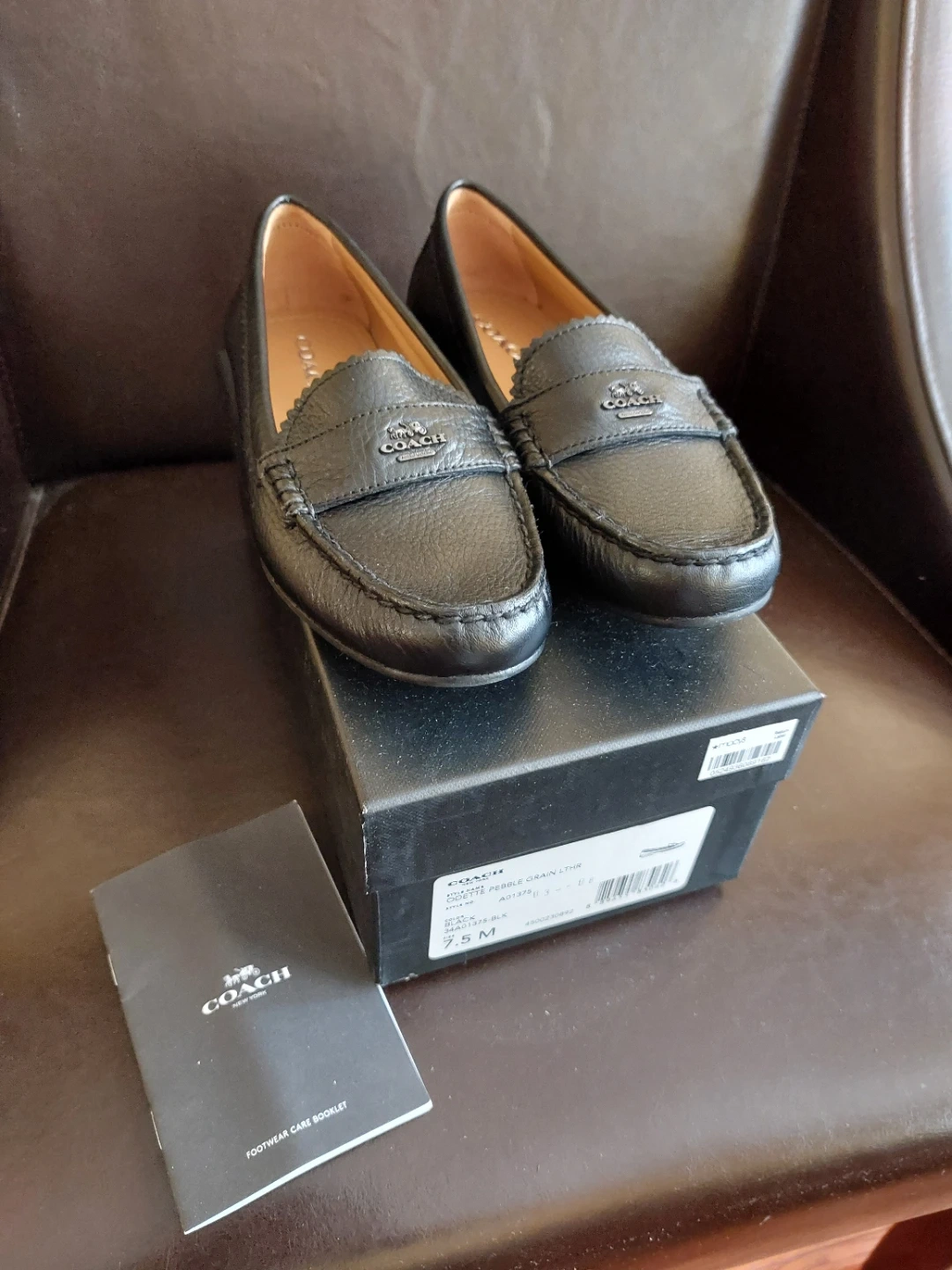 Classic black Coach loafers made from pebble grain leather, size 7.5. These shoes feature a comfortable slip-on design with the iconic Coach logo accent. They include the original box and care booklet. They are totally new, and the model is discontinued. Don't lose the opportunity to own one.