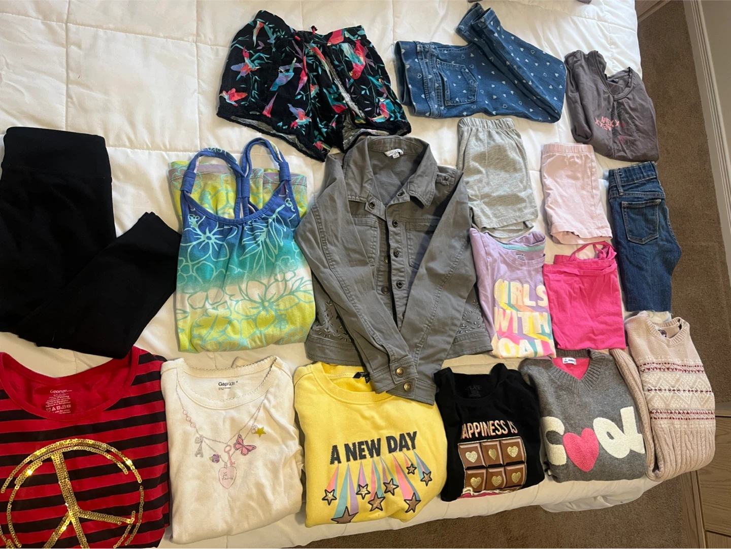 This bundle includes various tops, bottoms, and a jacket for girls. Items feature bright colours and fun graphics. Includes a grey denim-style jacket and a patterned sundress.