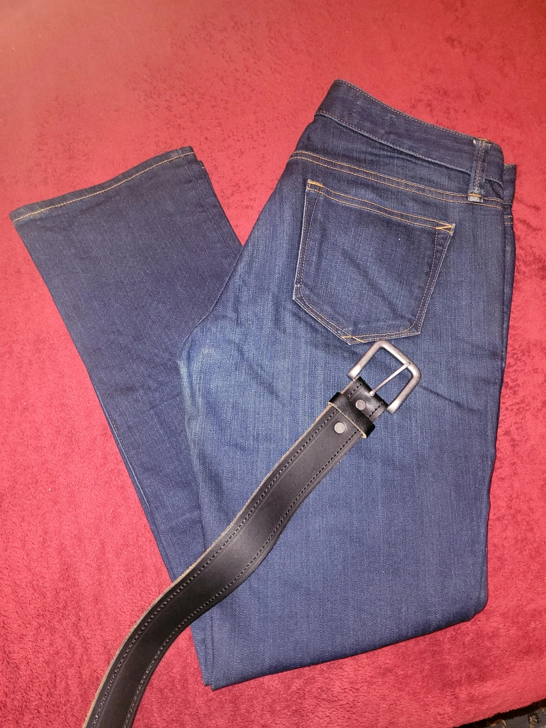 These are Gap 1969 Real Straight jeans in a dark wash denim. They're a size 29 waist. This classic style is great for everyday wear.