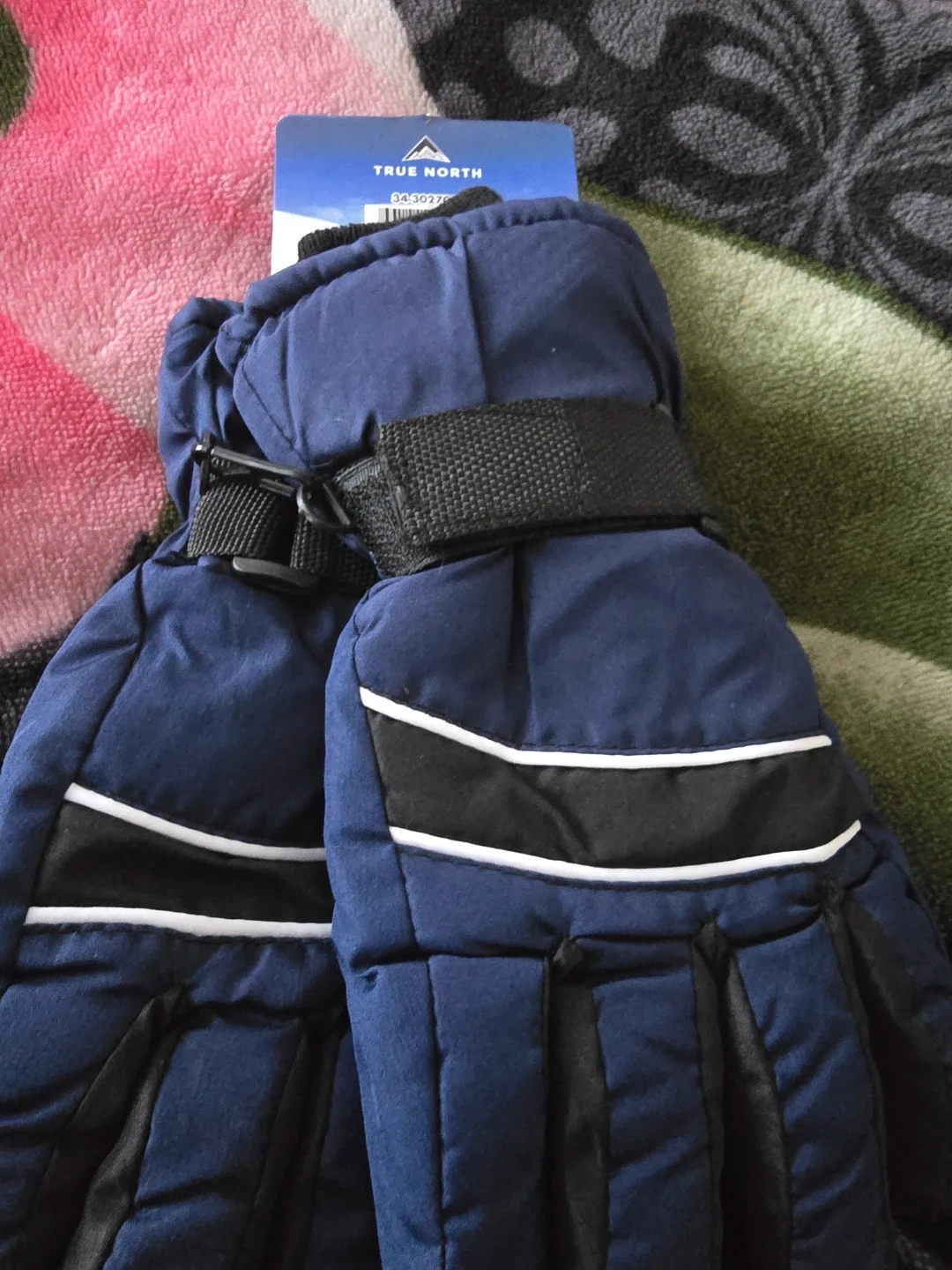 These True North ski gloves are designed for youth. They're blue with a black cuff and adjustable strap for a secure fit. Made for keeping hands warm during winter activities.