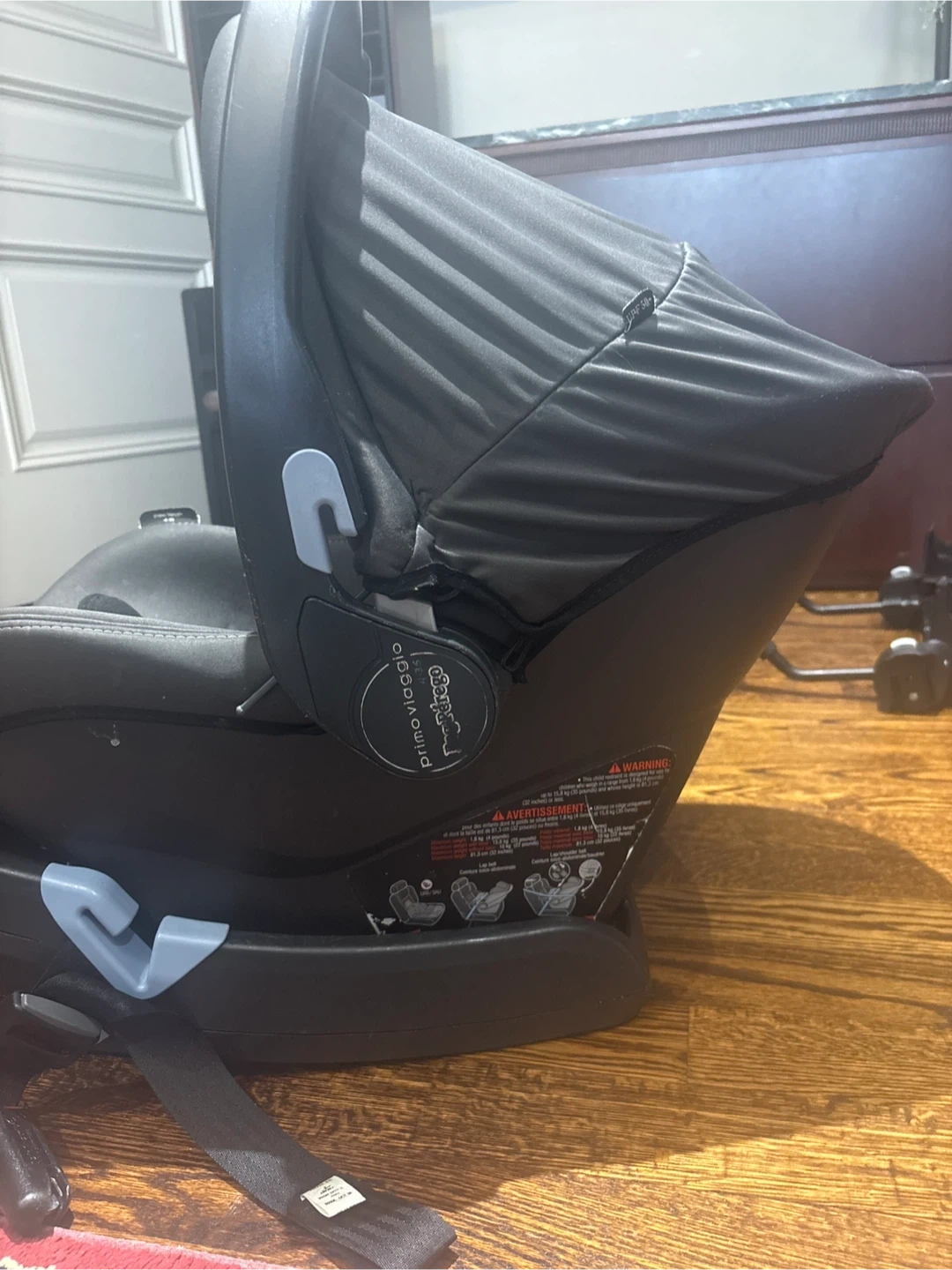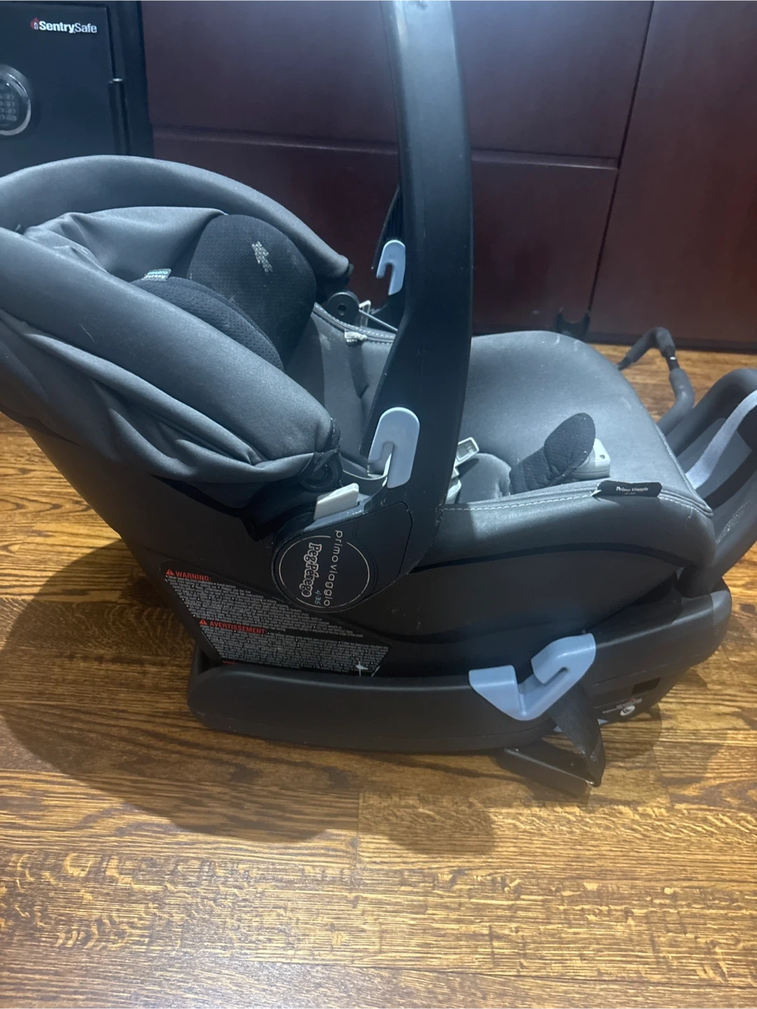 This is a Peg Perego Primo Viaggio infant car seat. It features a comfortable padded interior and an adjustable canopy for sun protection. It's designed for infant travel and attaches securely to its base.selling car seat, base and stroller attachment