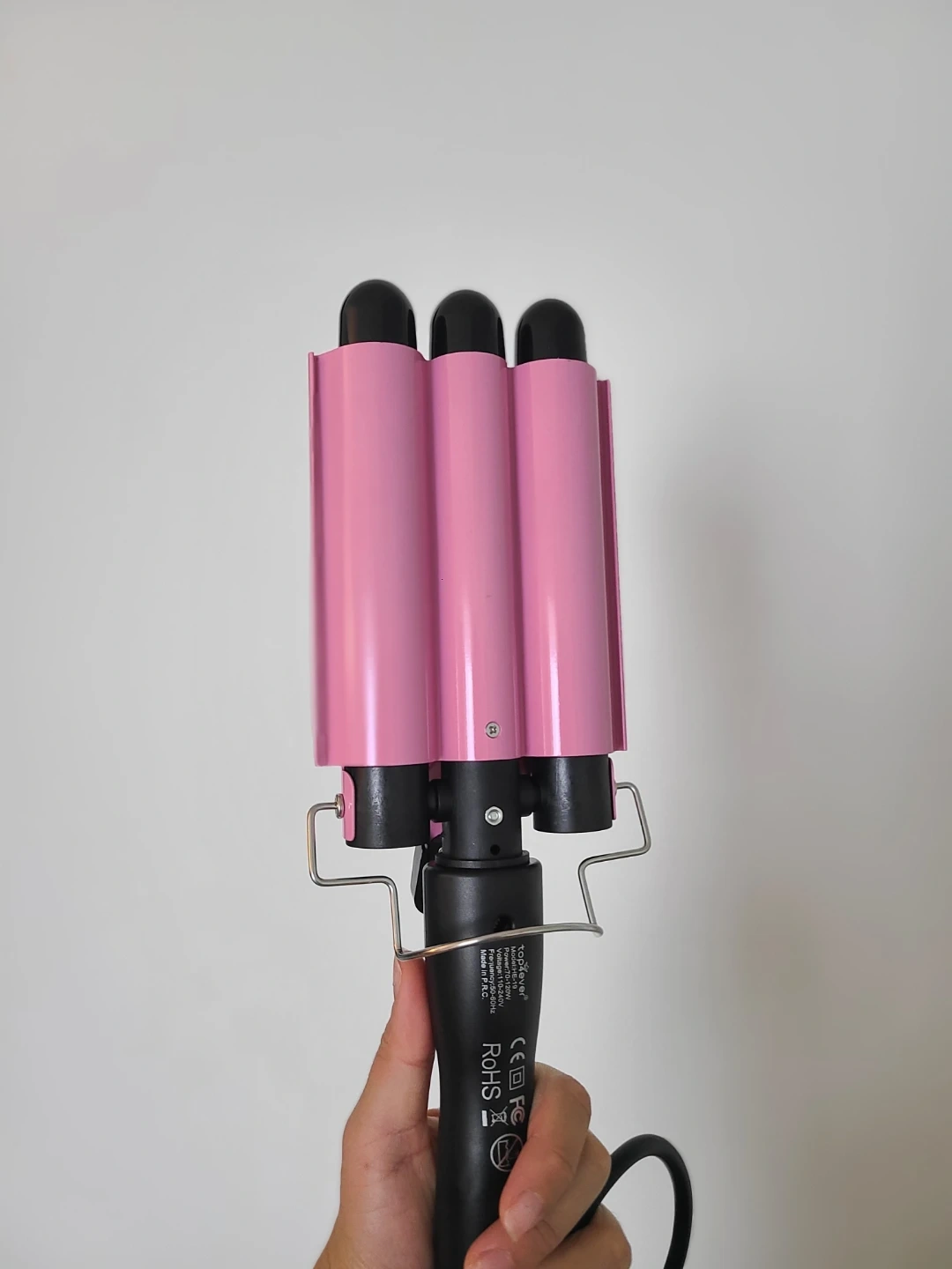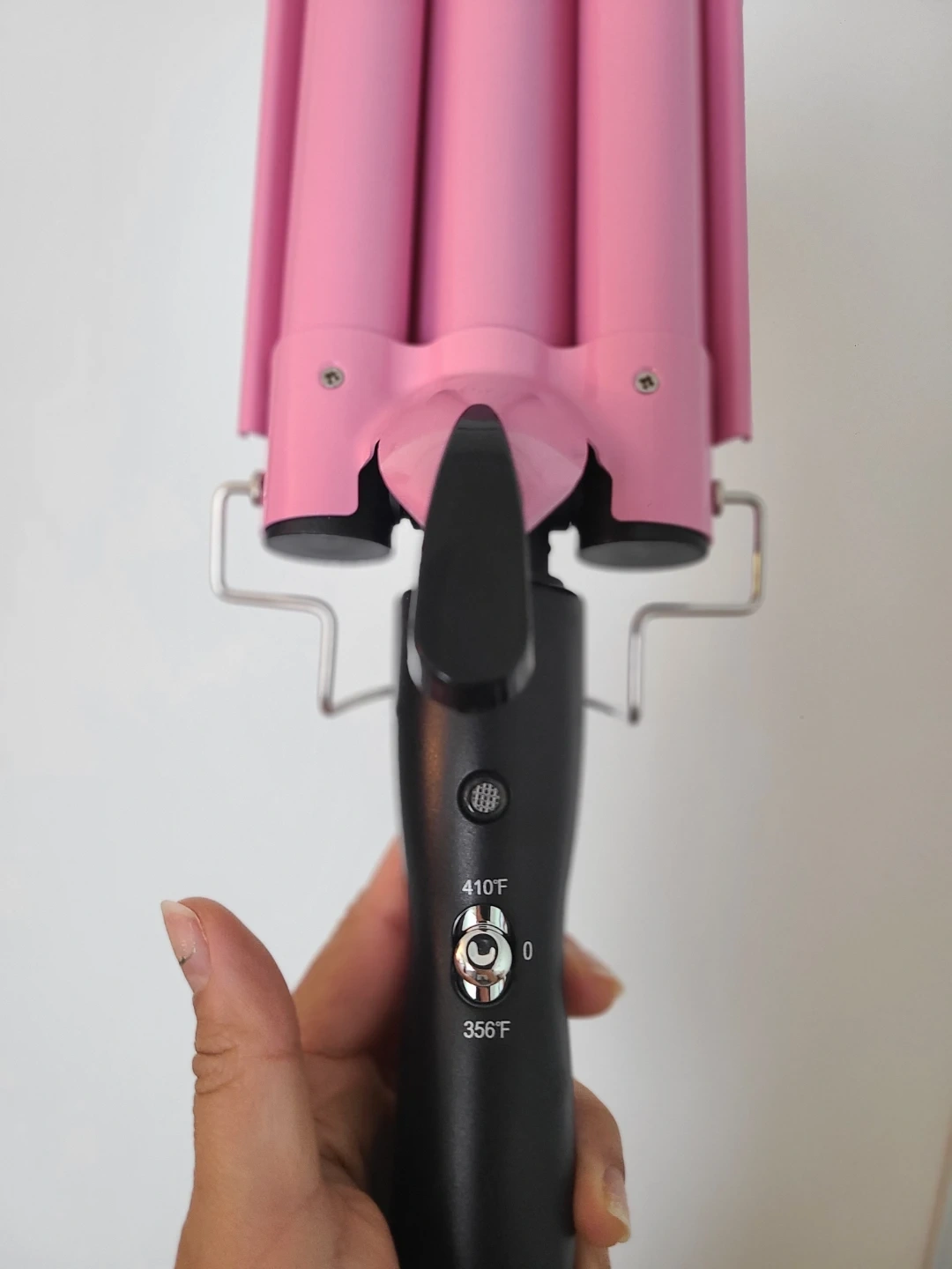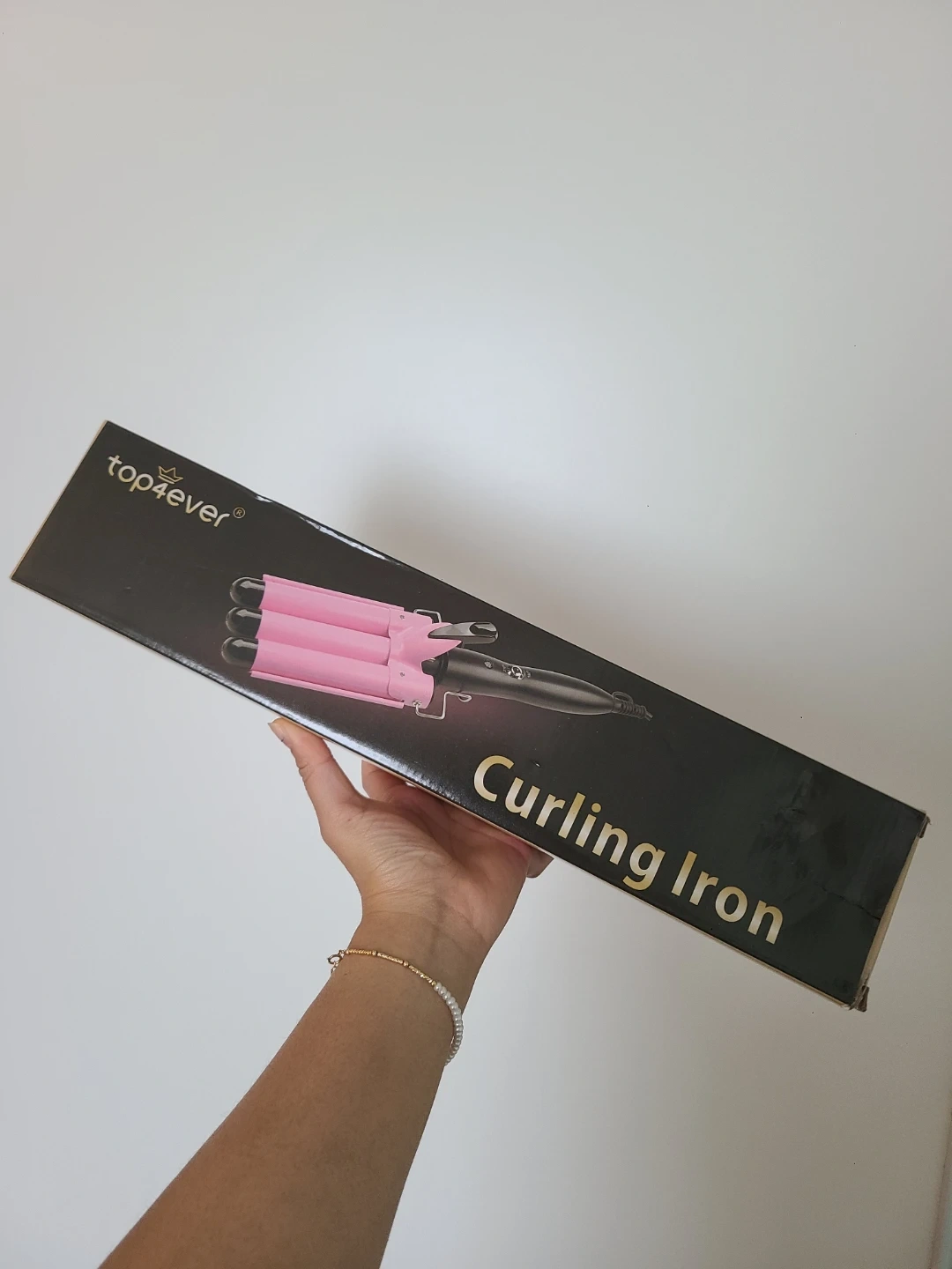 Pink 25mm triple barrel curling iron from Top4Ever. It offers two heat settings, 356°F and 410°F. Included are a heat-resistant glove and two hair clips for styling ease. Only used once, great condition.