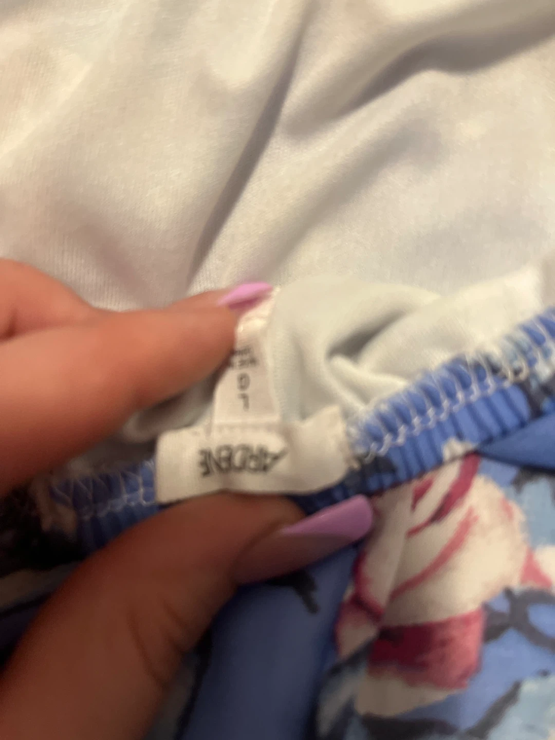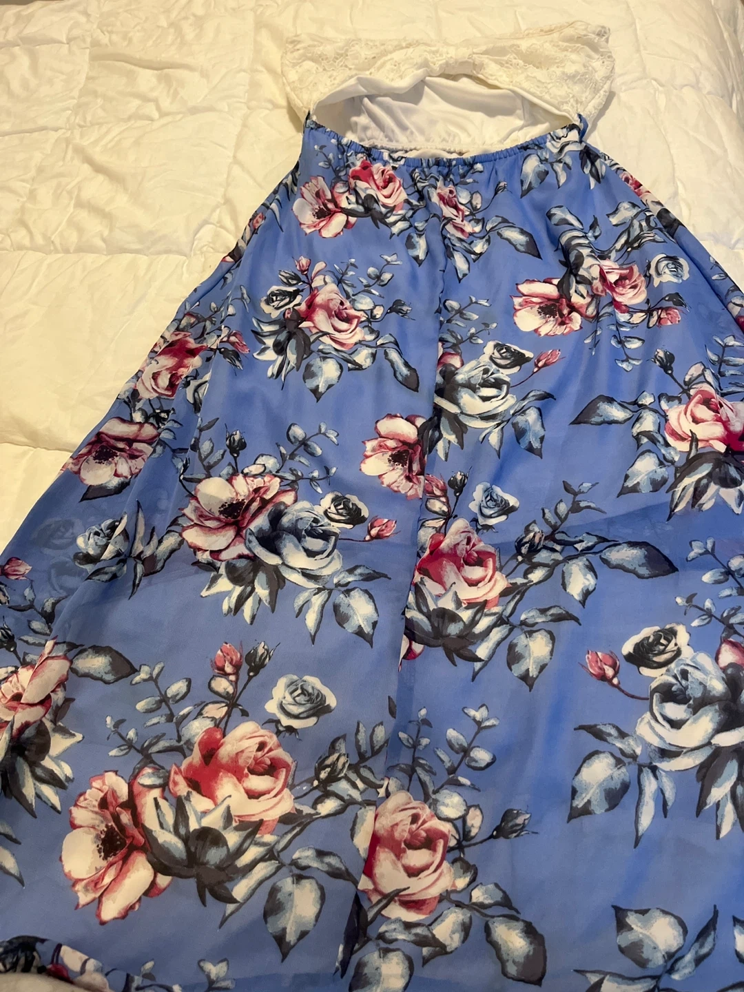 This is a blue floral maxi dress from Ardene. It features a lace top and a flowy, high-low skirt. Great for warmer weather!