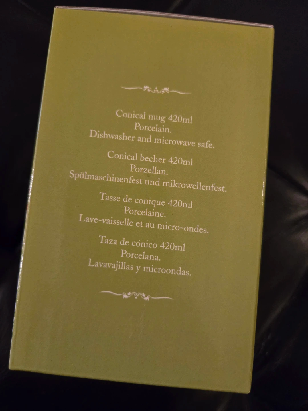 This is a Maxwell & Williams William Morris "Golden Lily - White" conical mug. It's made of porcelain and has a 420ml capacity. It's also dishwasher and microwave safe!