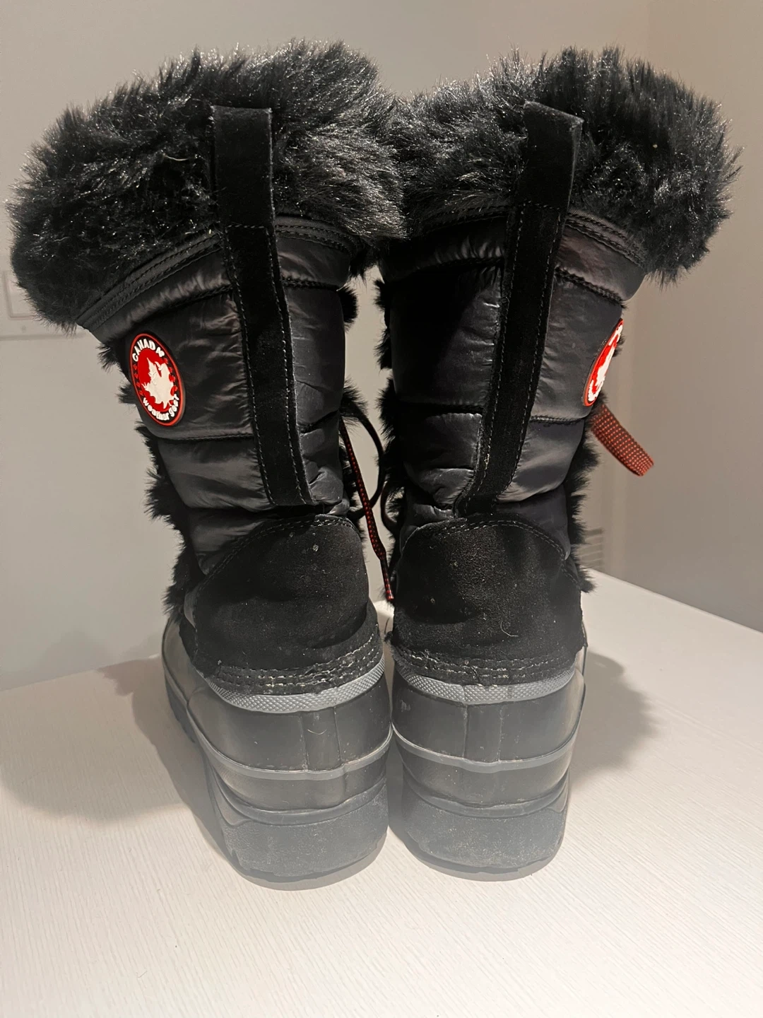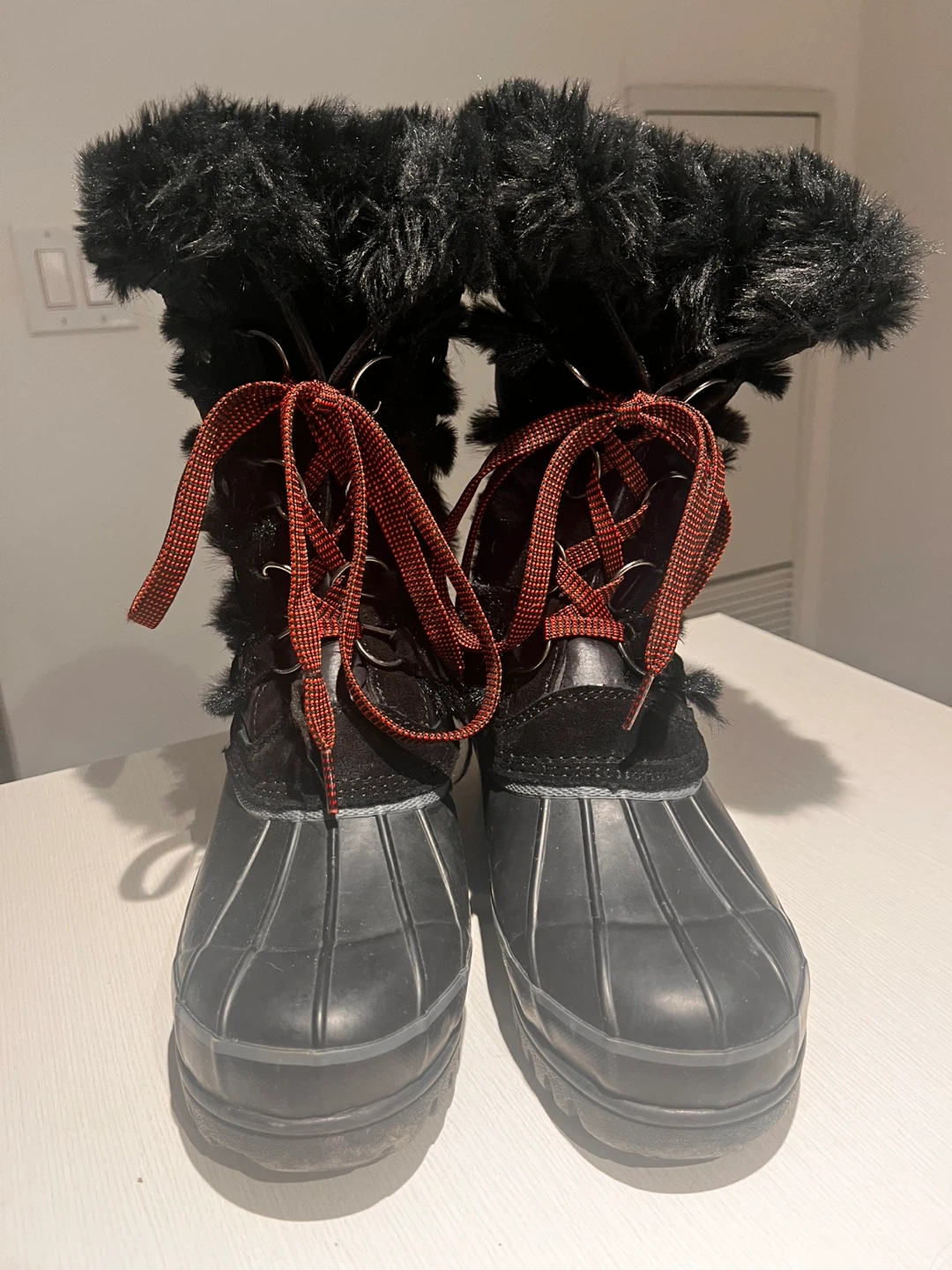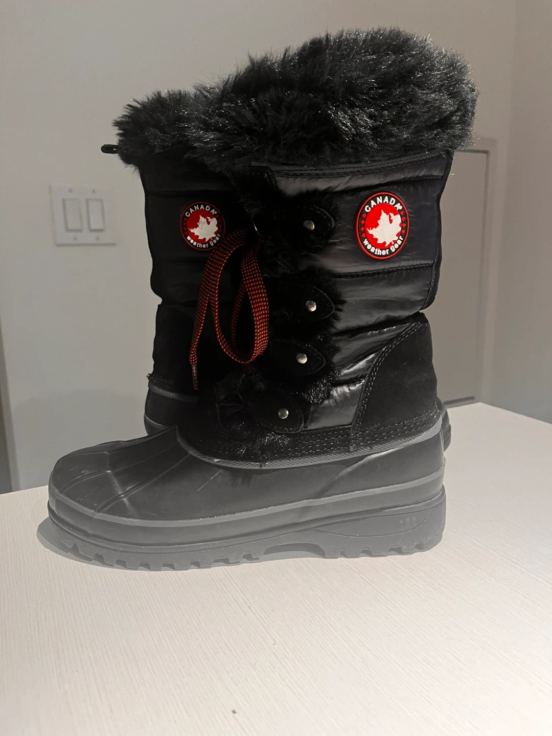 Keep your feet warm and dry with these stylish black snow boots from Canada Weather Gear. They feature a durable man-made upper and outsole, perfect for winter adventures. Includes faux fur trim for added warmth and style. Size is 8M.
