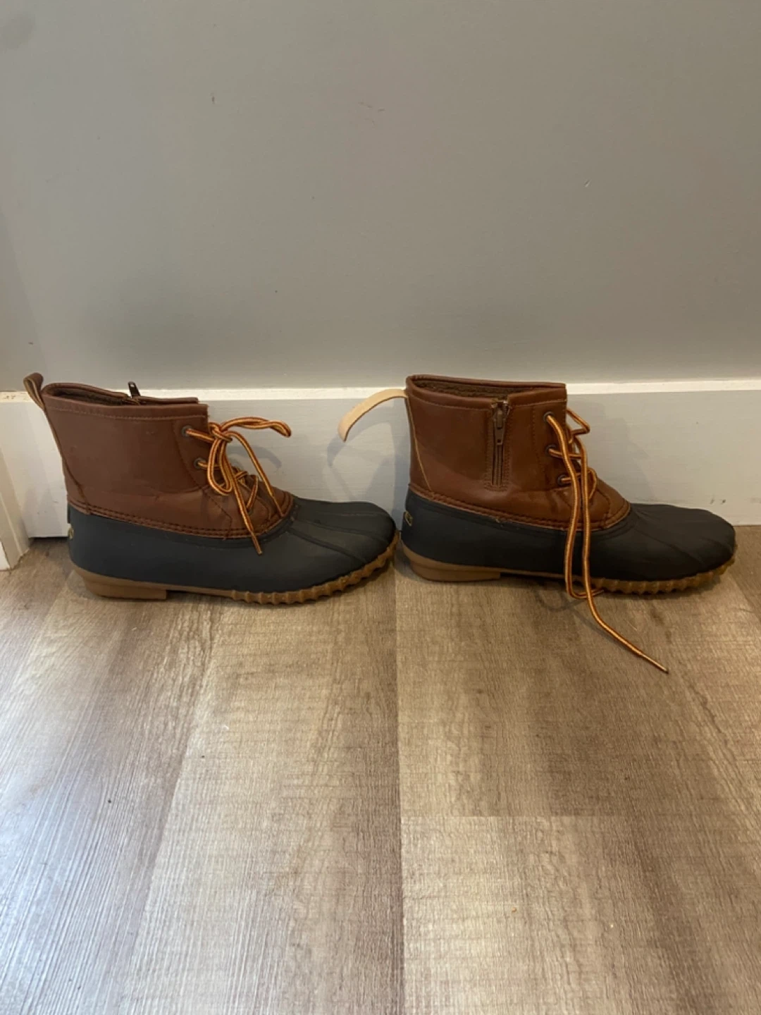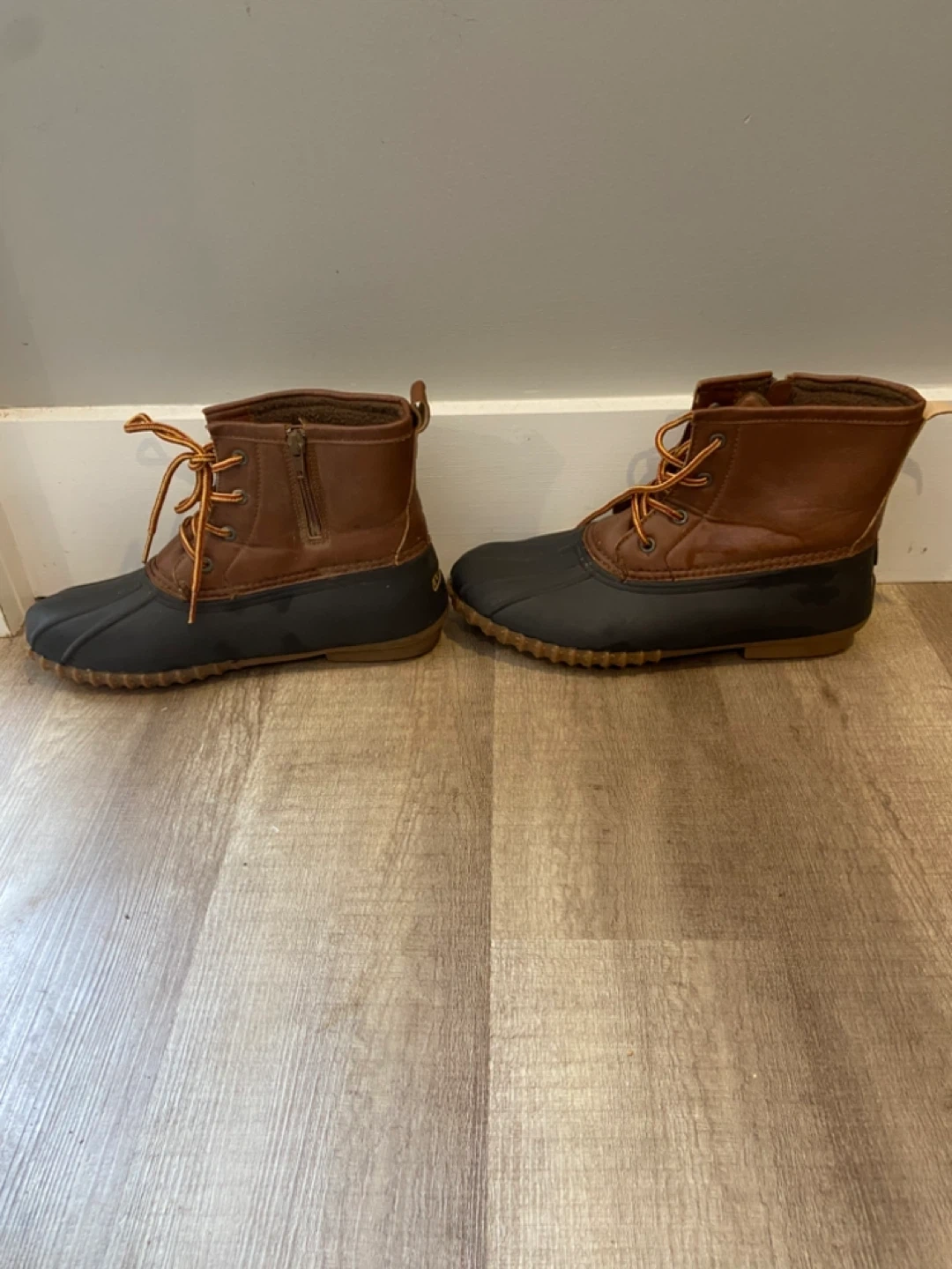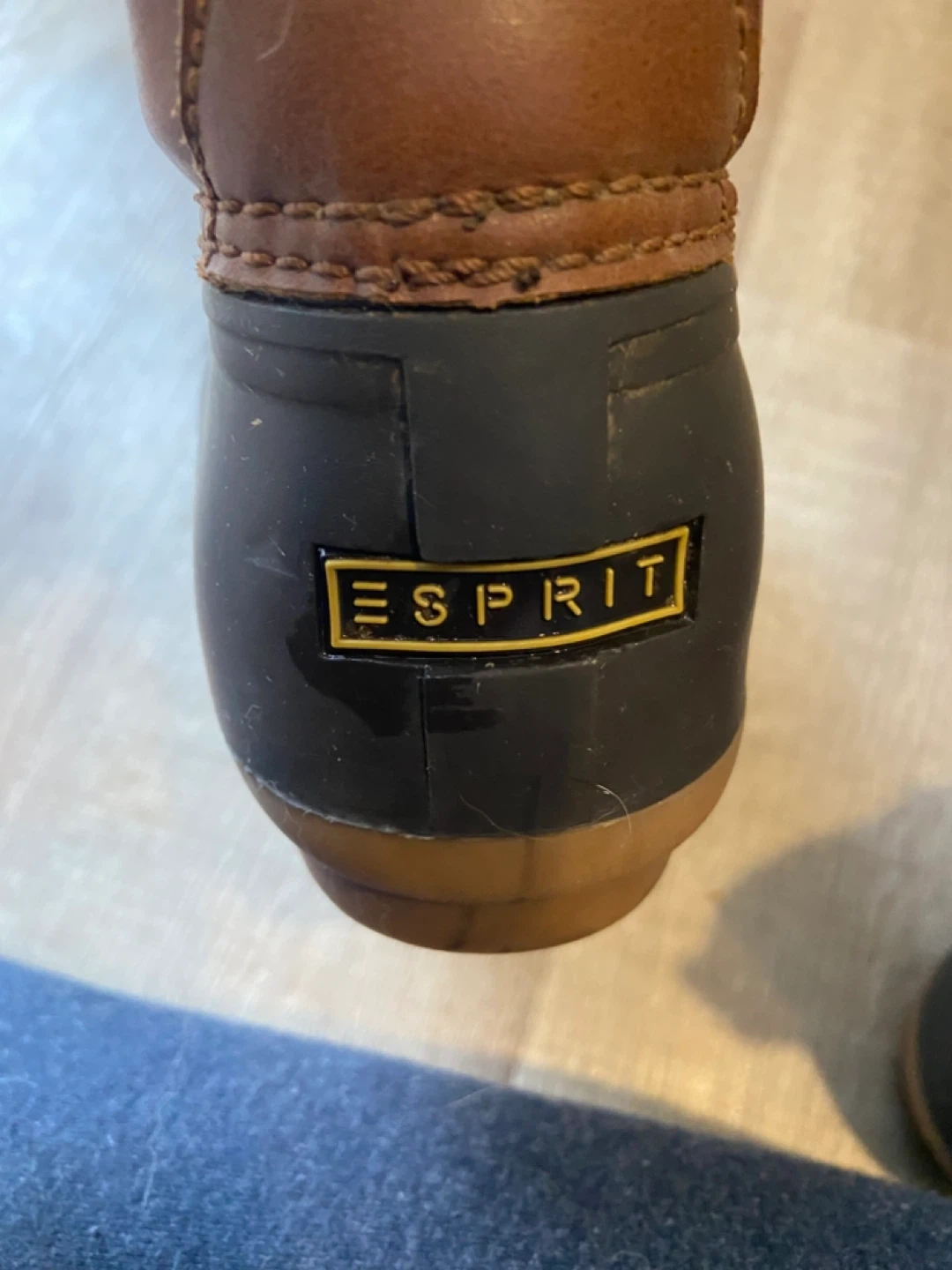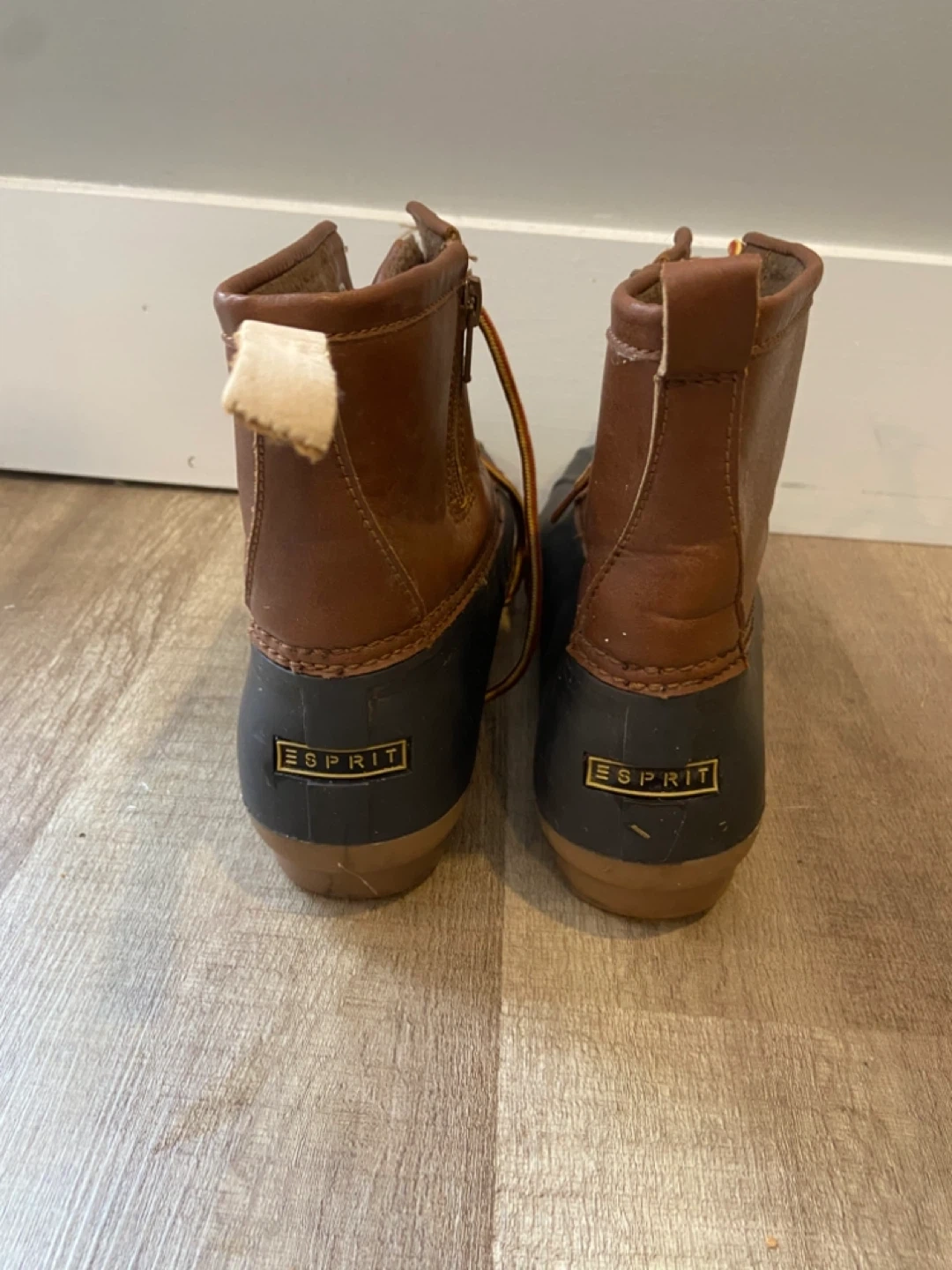 Size 10 Esprit women's duck boots in brown. Waterproof rubber lower with leather upper. Features side zippers and lace-up fronts for a secure fit. These boots are great for keeping your feet dry on rainy or snowy days! One pull on tab in back of left pair is broken but otherwise boots in mint condition.