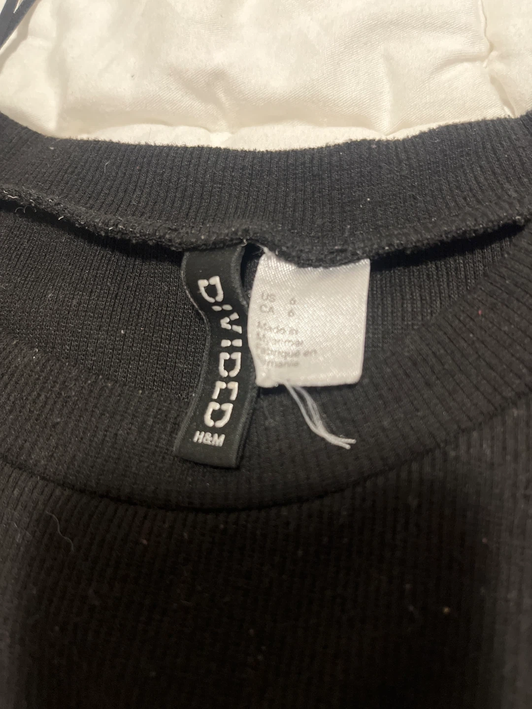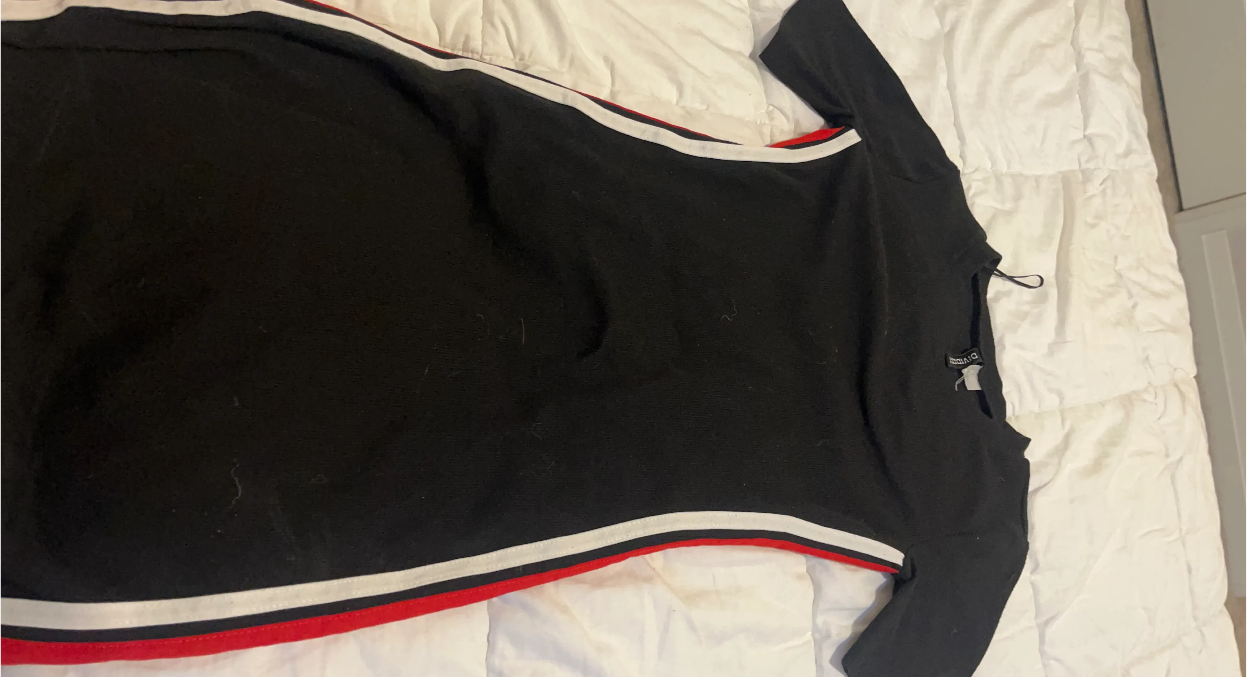 This is an H&M black dress with sporty red and white stripes along the sides. It's a size 6. The material feels like a comfortable blend.