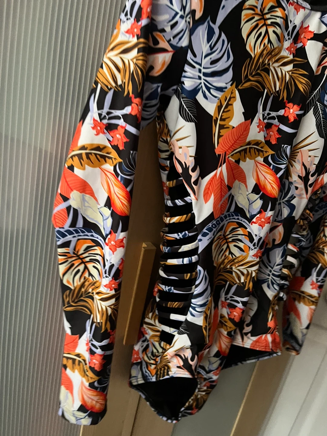 This long-sleeve one-piece swimsuit features a vibrant tropical leaf and floral print. It has a zippered back and cut out detailing on the sides. It's perfect for swimming or any water activity!