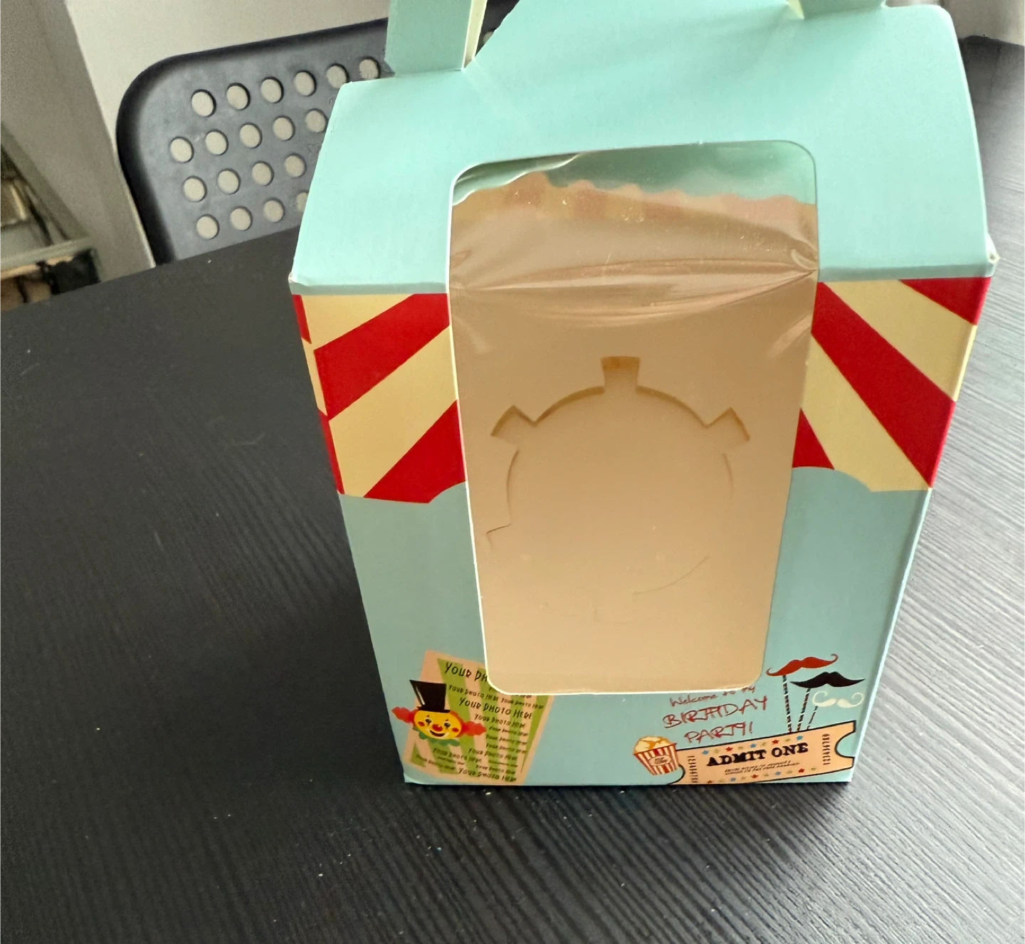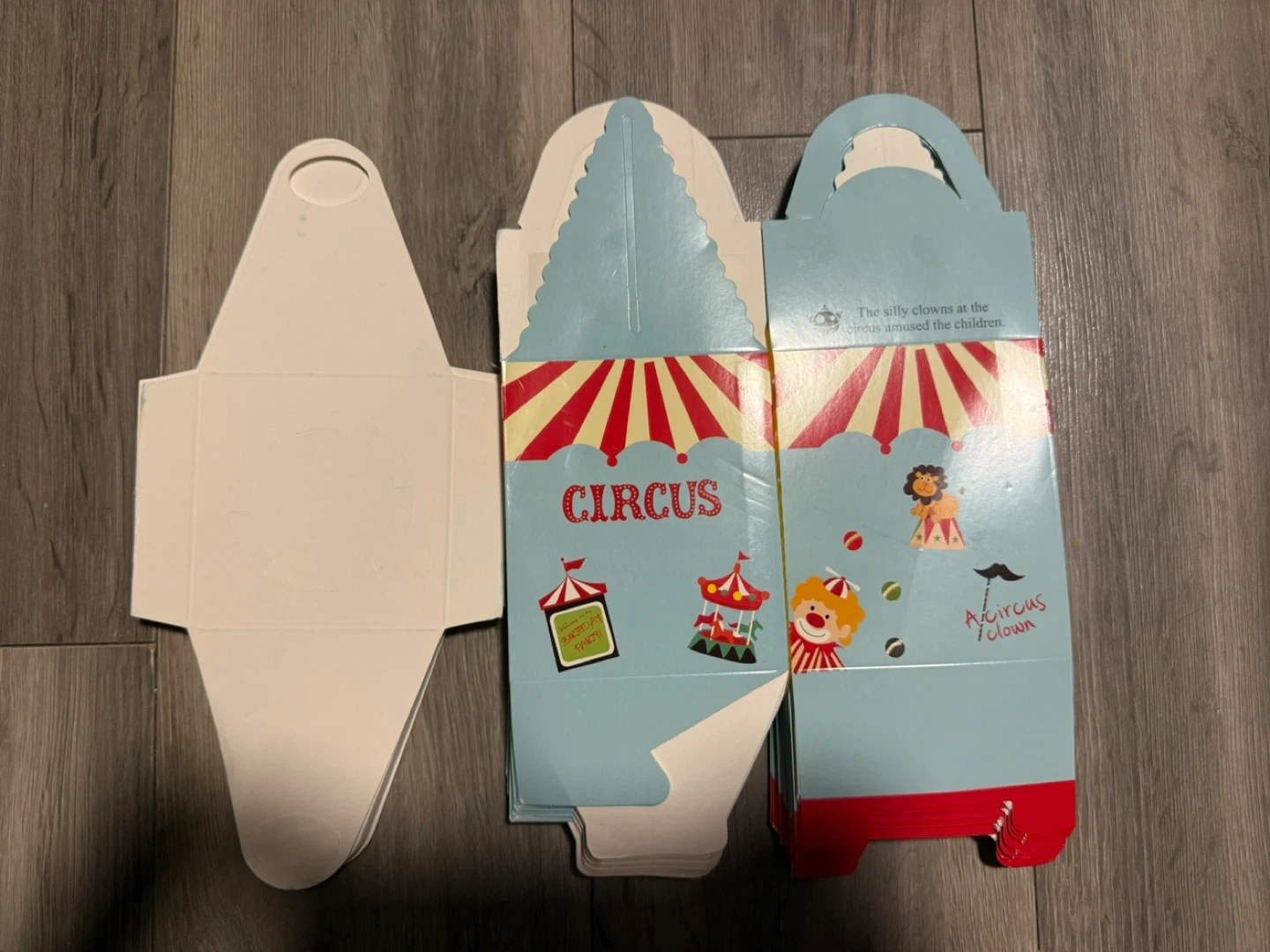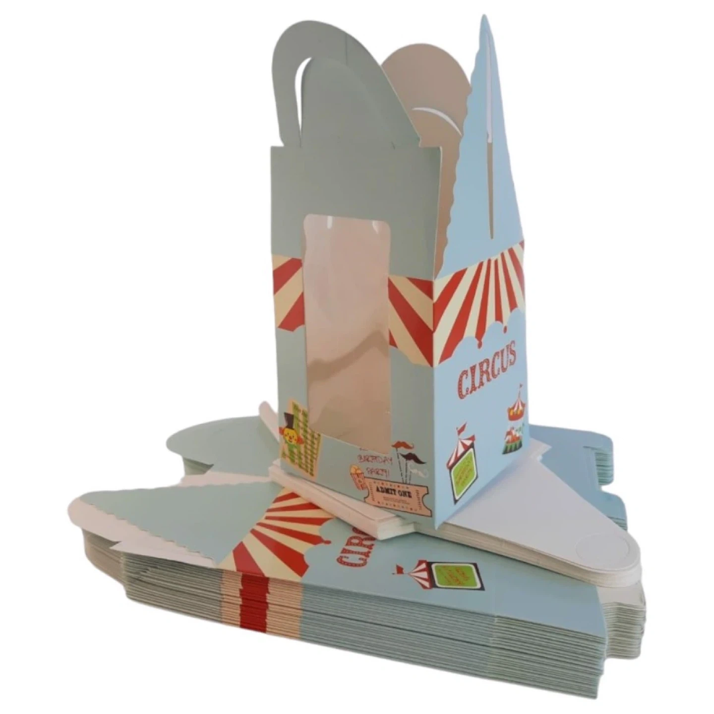 These adorable circus-themed treat boxes are perfect for birthday parties! They feature a fun clown and circus tent design with a clear window. Box dimensions are approximately 9cm x 9.5cm x 11cm.