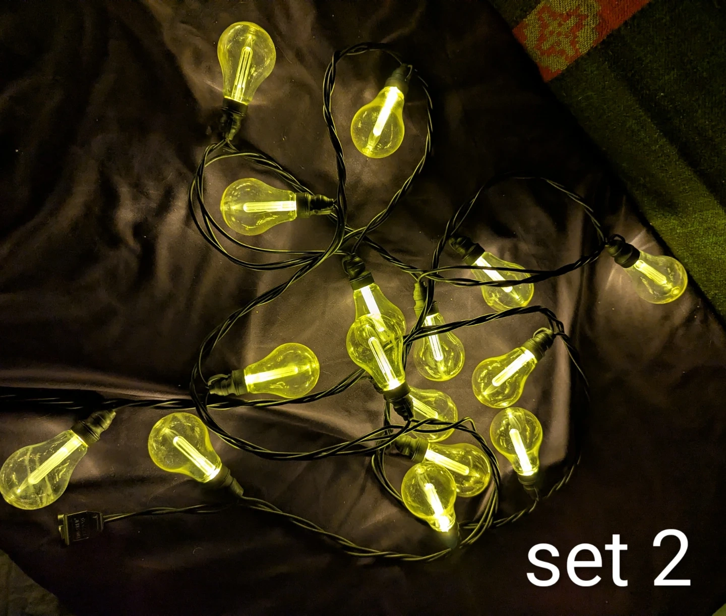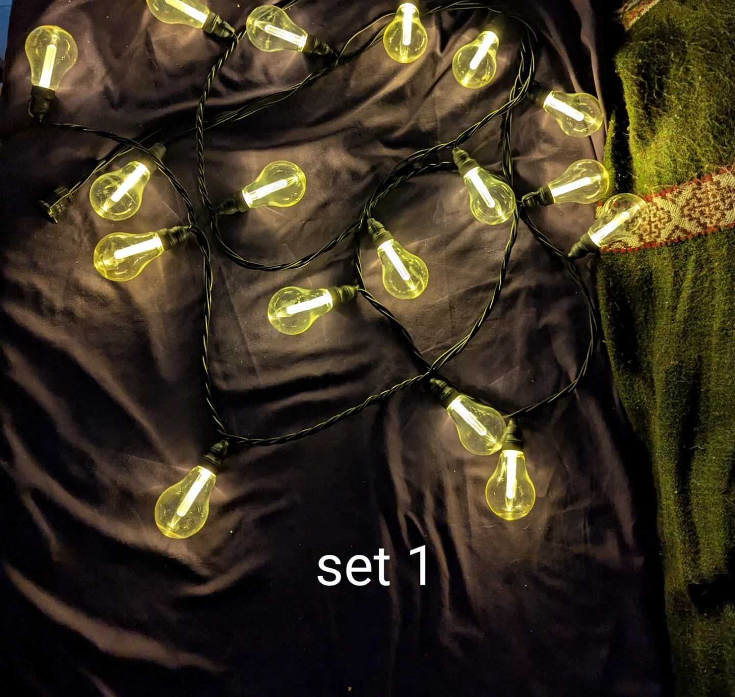 2 sets of 13ft outdoor light strings each with 20 durable, non glass, edison looking bulbs.
