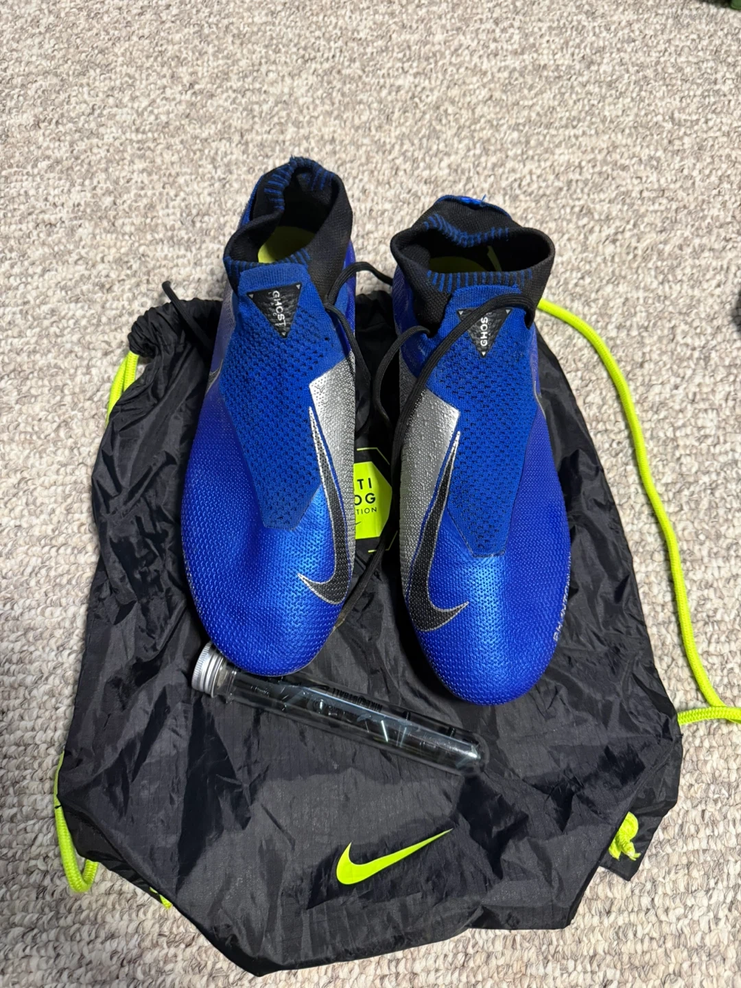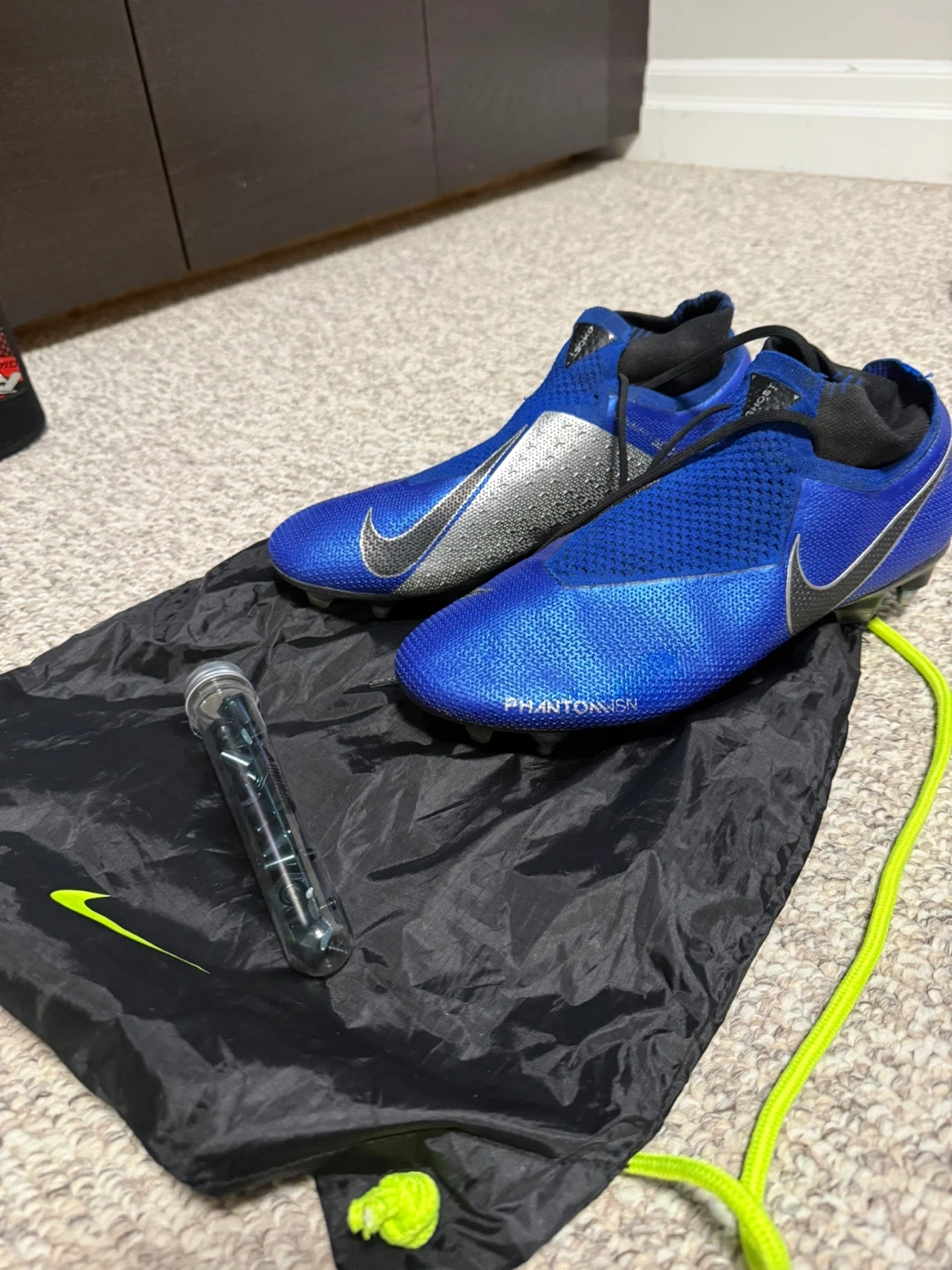 US 10. These Nike Phantom VSG1 Elite Dynamic Fit FG soccer cleats are blue and silver. They come with a Nike drawstring bag and a small tube of replacement studs. These cleats are designed for firm ground.