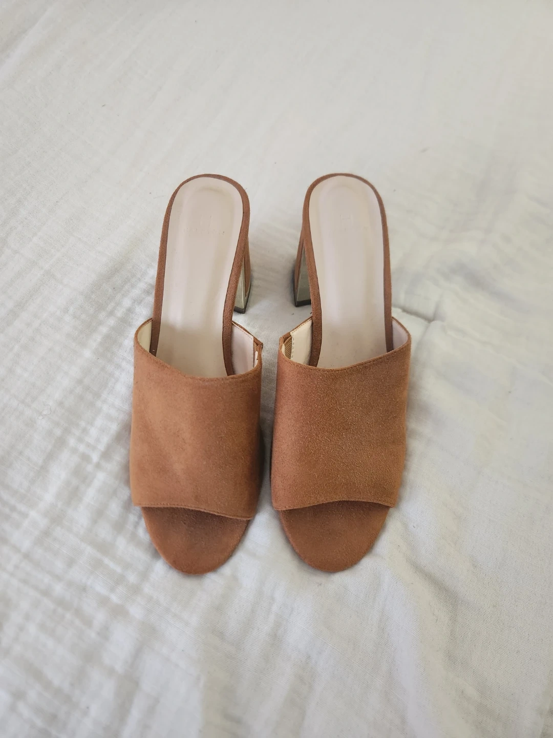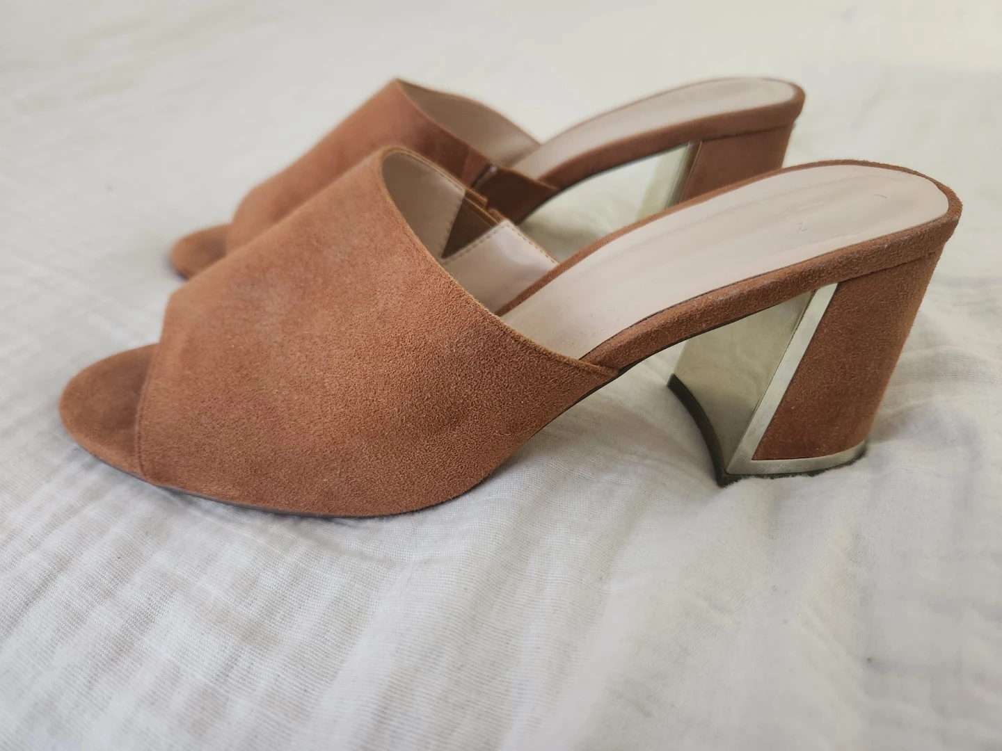 Stylish brown suede heeled mules with a metallic accent on the block heel. Open-toe design with a comfortable slip-on style. These are great for dressing up any casual outfit!