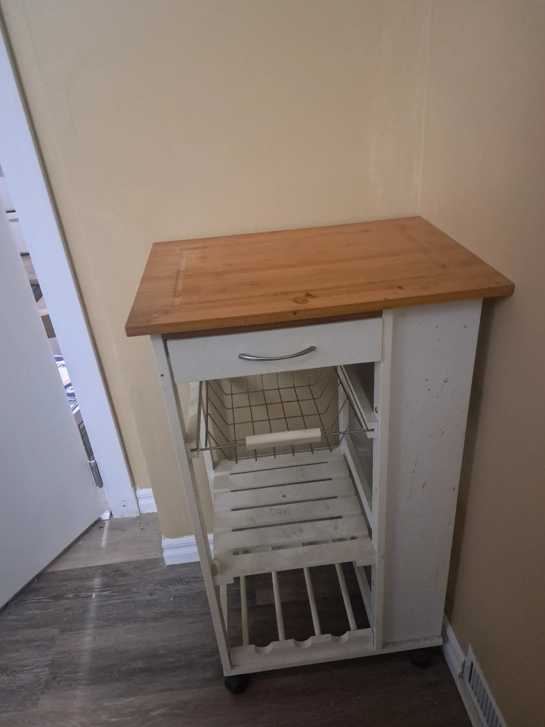 This kitchen cart features a pull-out drawer and multiple shelves. It's made with a wooden top and a white base. Includes a wire basket and bottle rack. It's on wheels for easy movement.