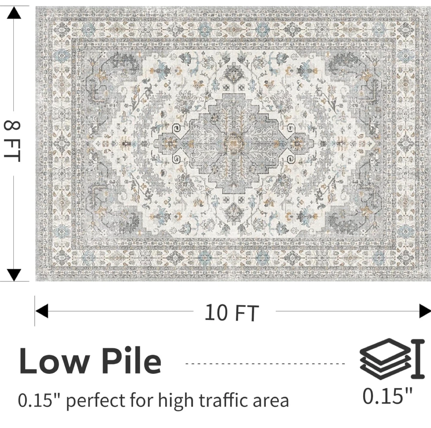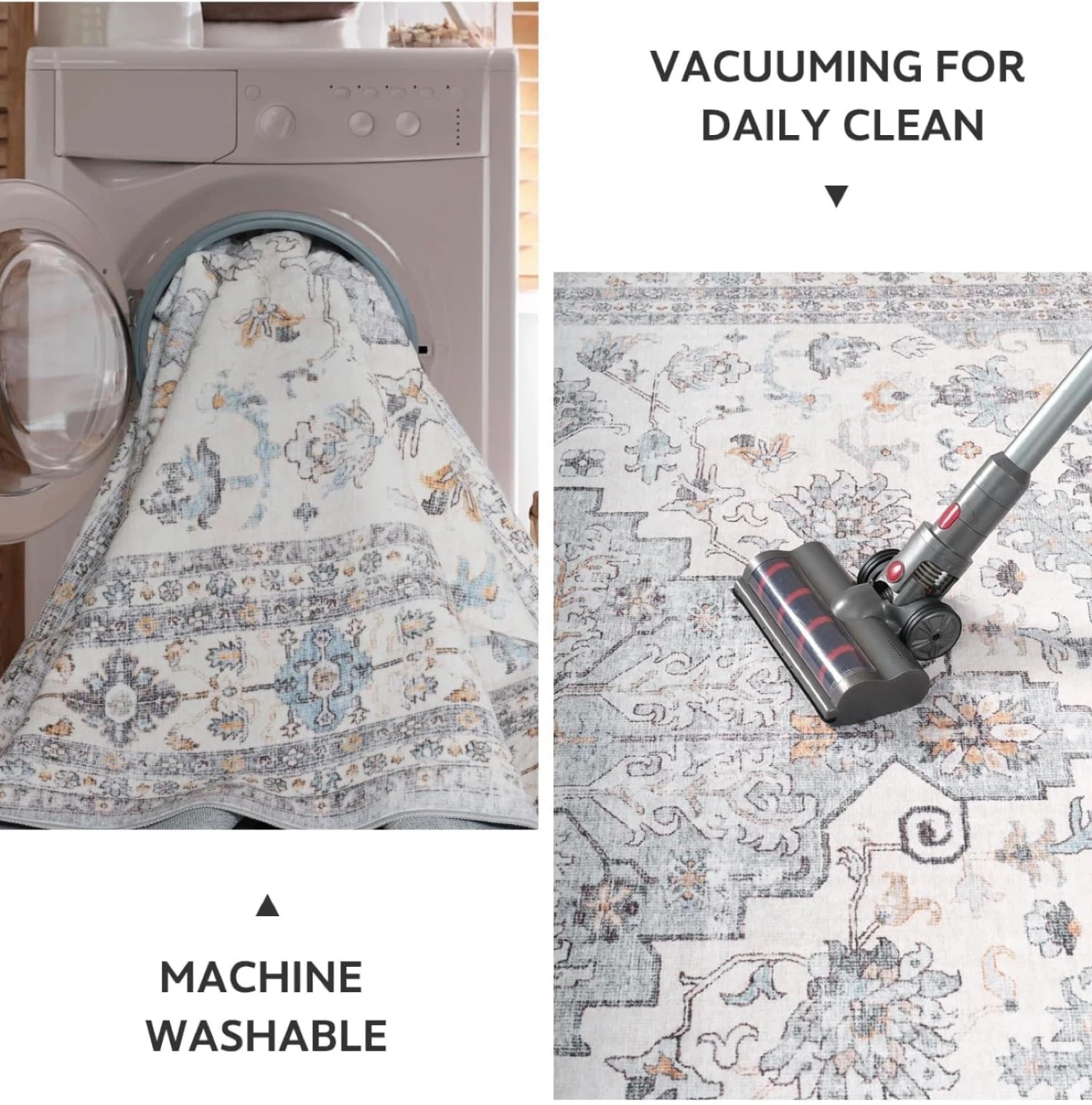 This machine washable rug features a unique pattern design with a non-slip backing. It's kids and pets friendly for daily clean vacuums. Great for any room!
