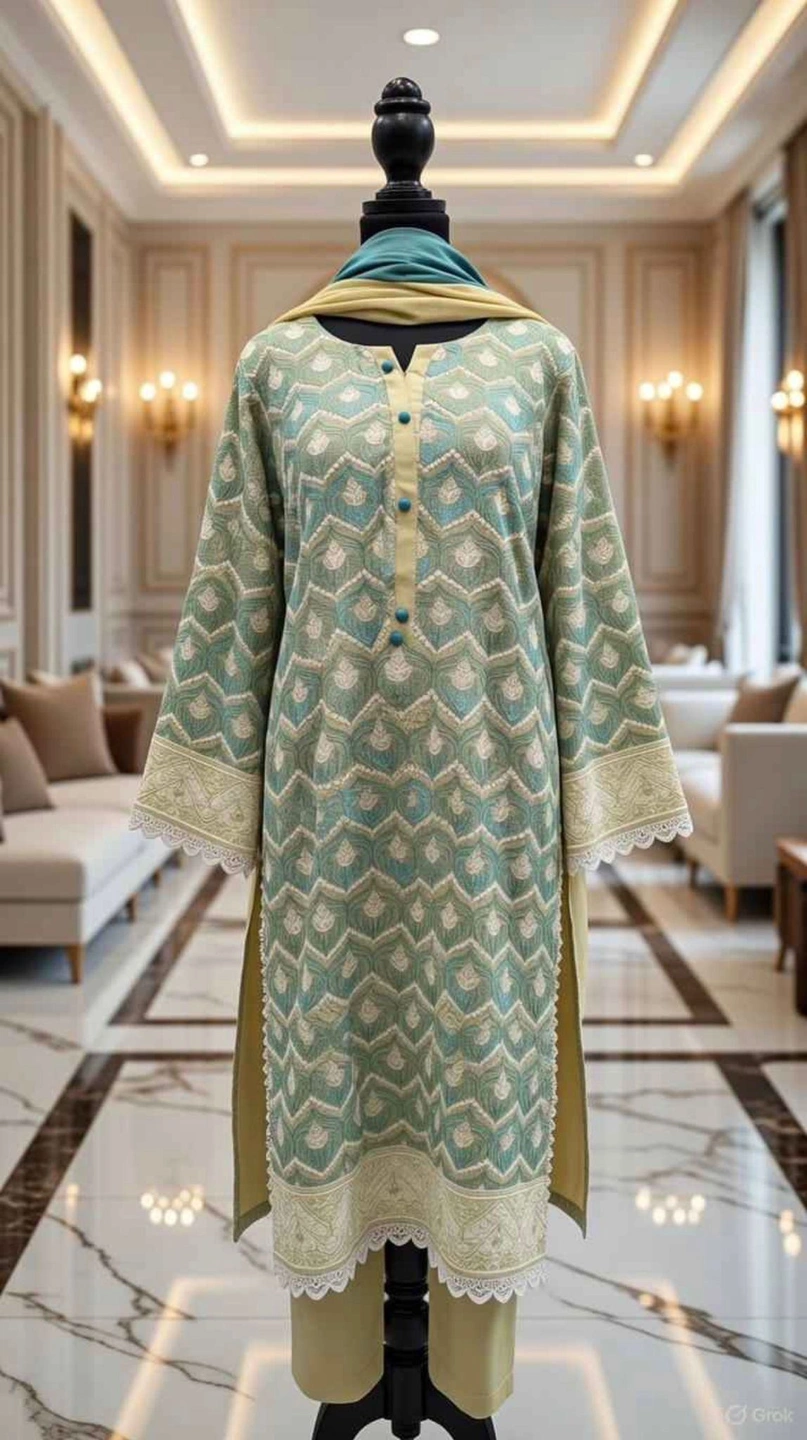 Green cotton embroidered 3-piece suit offers a fresh, graceful look with an all-over woven-style motif on the shirt, finished with intricate lace-trim borders at the sleeves and hem for a refined touch. The contrast neckline and button details add definition, while the matching trousers and coordinated dupatta complete the outfit with an effortless, put-together feel—ideal for brunches, family gatherings, and understated festive wear.