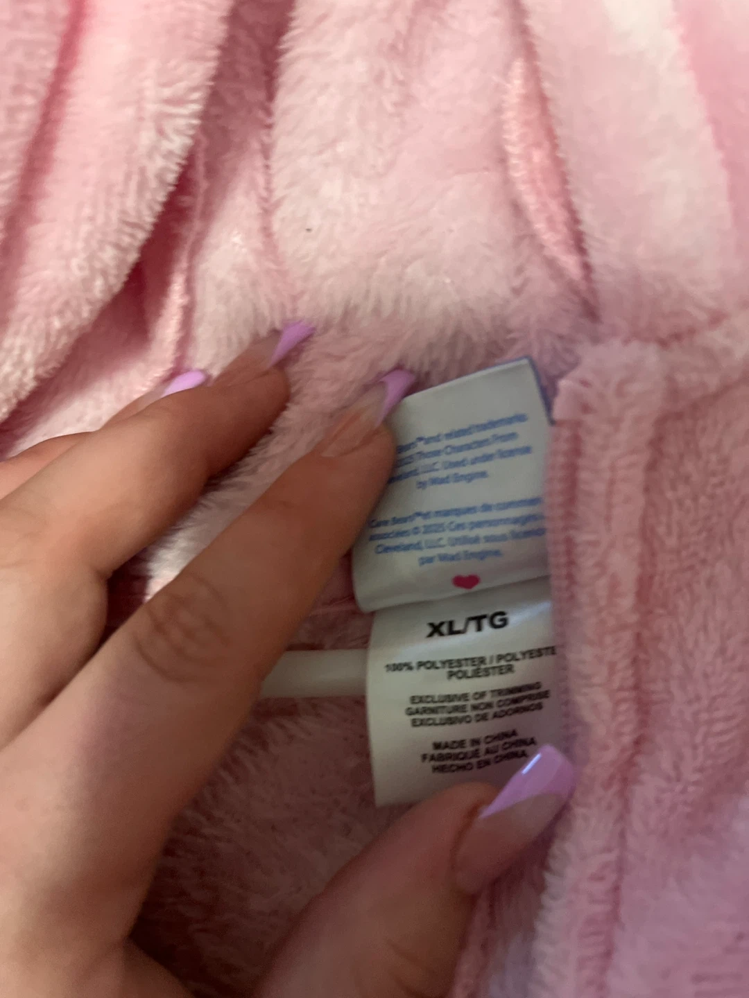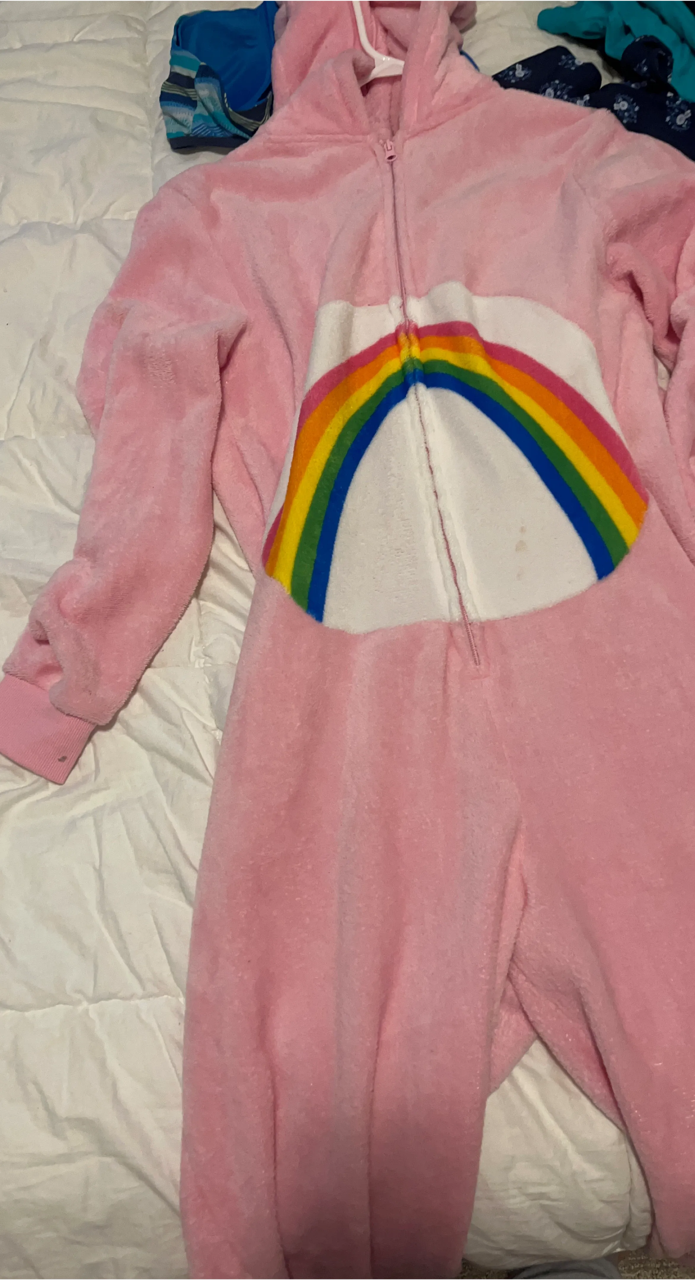 Cozy pink plush pajama onesie featuring a rainbow design. It's made of 100% polyester and is a size XL. Perfect for lounging around!