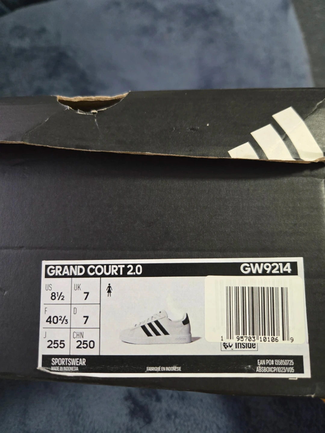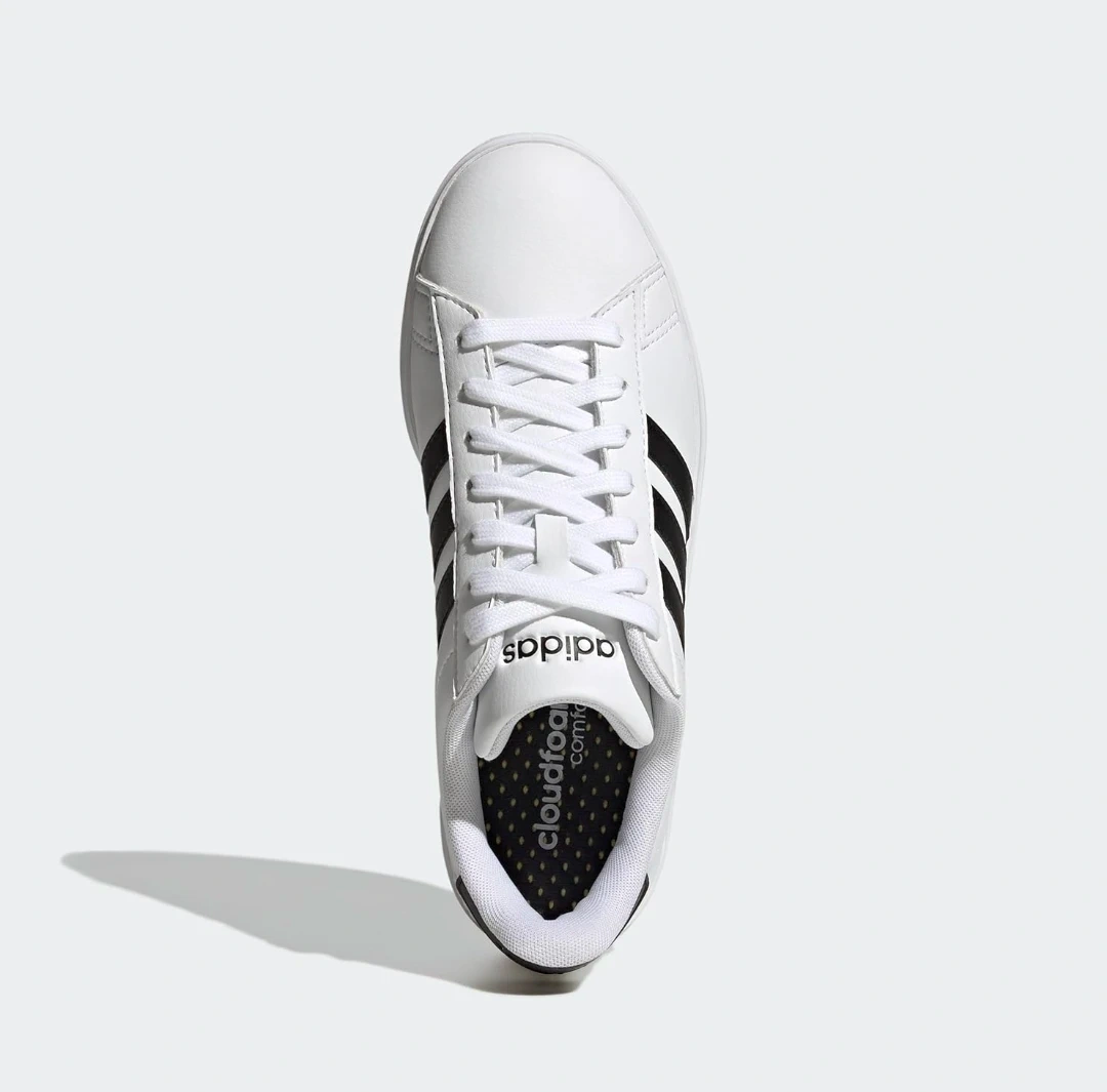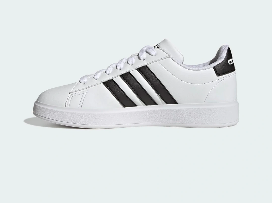 Adidas Grand Court 2.0 sneakers in white with black stripes. These shoes are a US size 8.5. They feature a classic design for everyday wear.