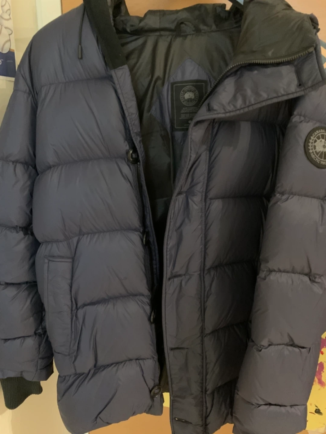 Canada Goose navy blue puffer jacket. Size L/G. Made in Canada with domestic and imported materials. It's a warm, insulated coat perfect for cold weather.