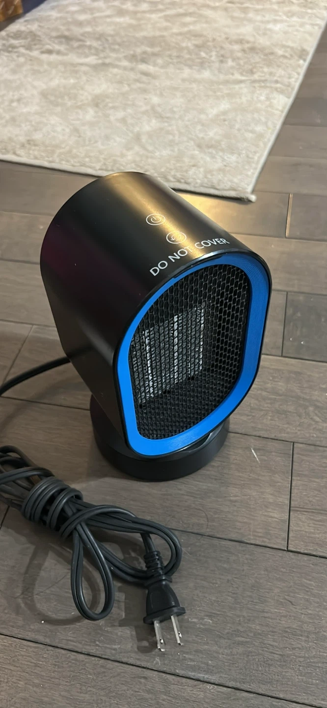 Compact black electric heater with blue trim. It features a safety warning "DO NOT COVER". This unit is designed for personal space heating.