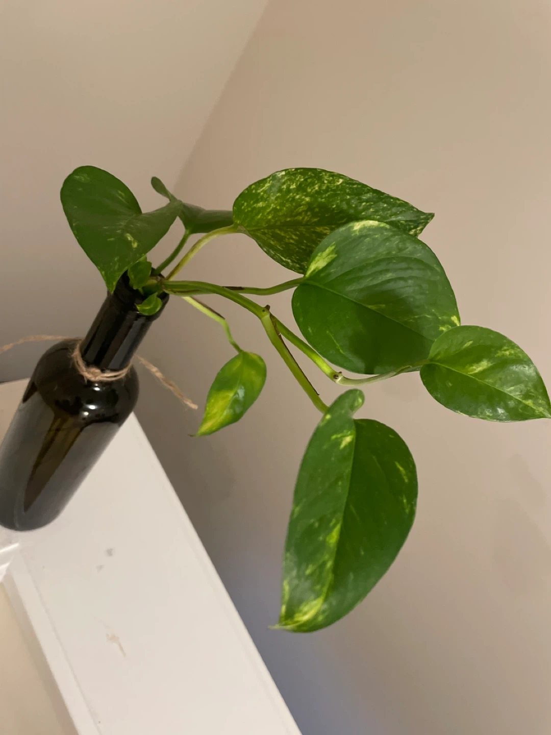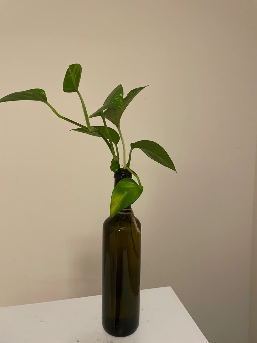 A Pothos plant cutting rooted in a dark green glass bottle. Twine accents the bottle neck. Easy to care for and grows quickly!