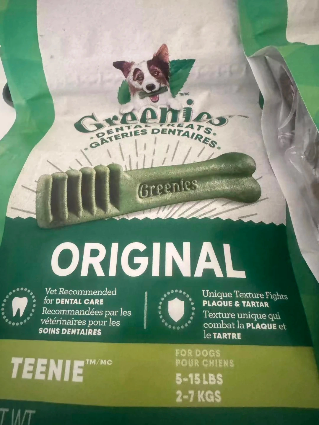 These Greenies Original Teenie dental treats are vet recommended for dental care. They have a unique texture that fights plaque and tartar. For dogs 5-15 lbs. 3 bags.