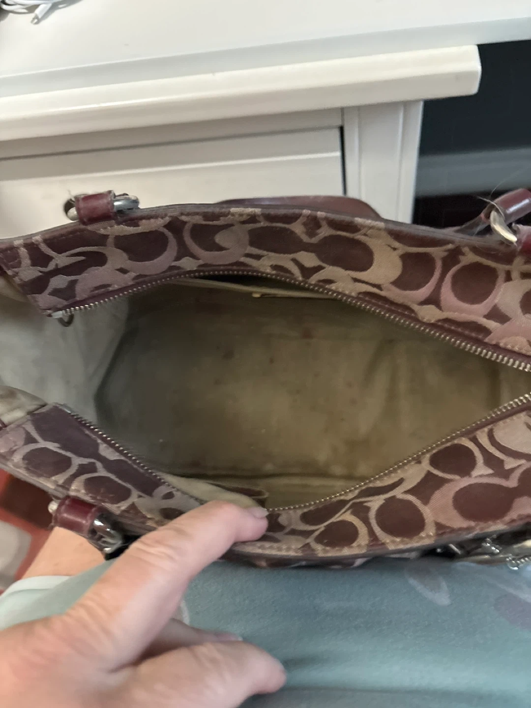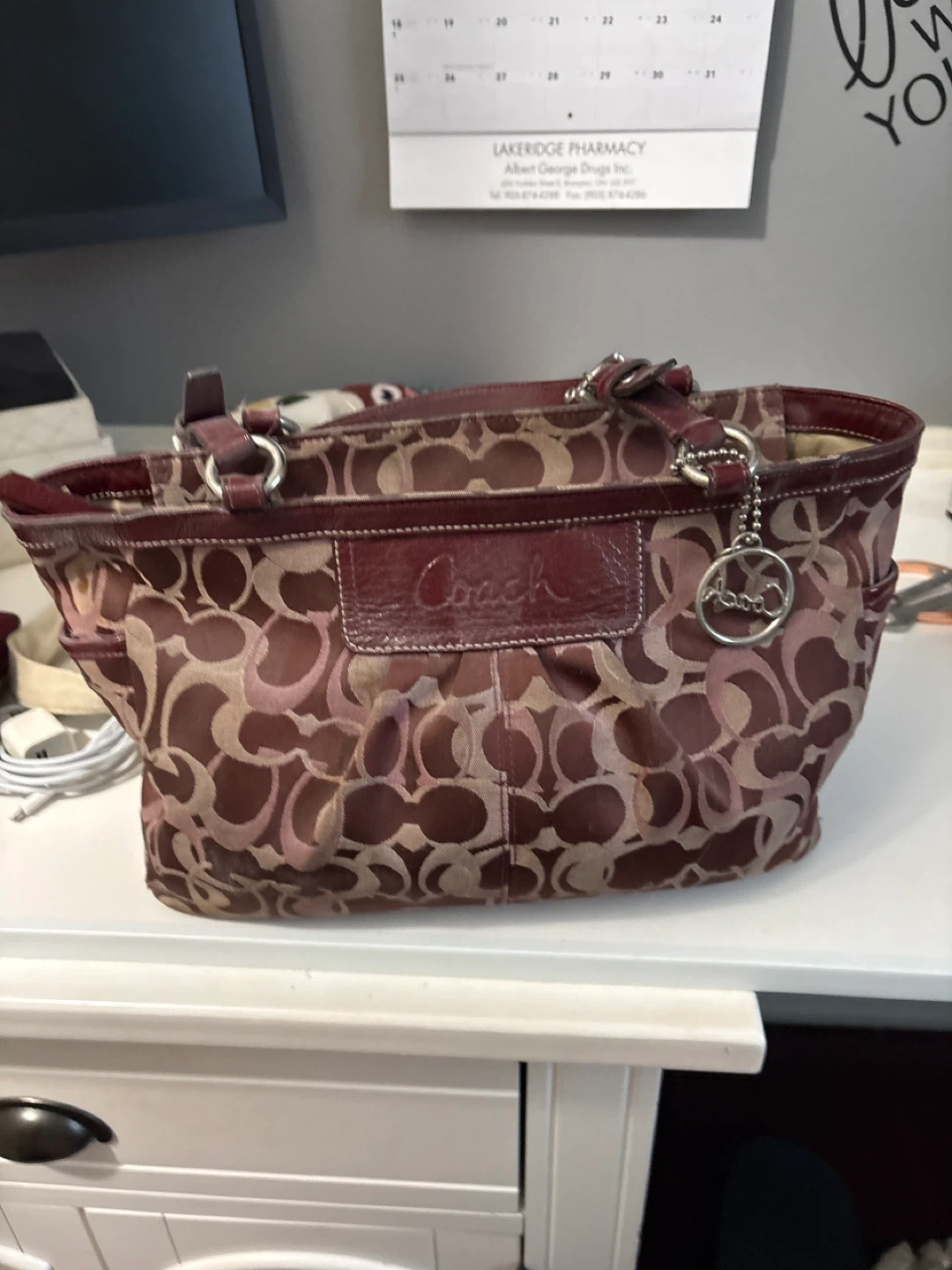 This is a Coach Signature C Monogram tote bag. It features the classic Coach 'C' pattern in a pinkish-tan hue with dark red leather trim and handles. The interior is lined and has pockets for organization. It's a stylish everyday bag.