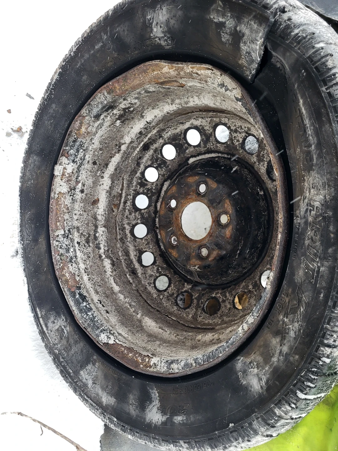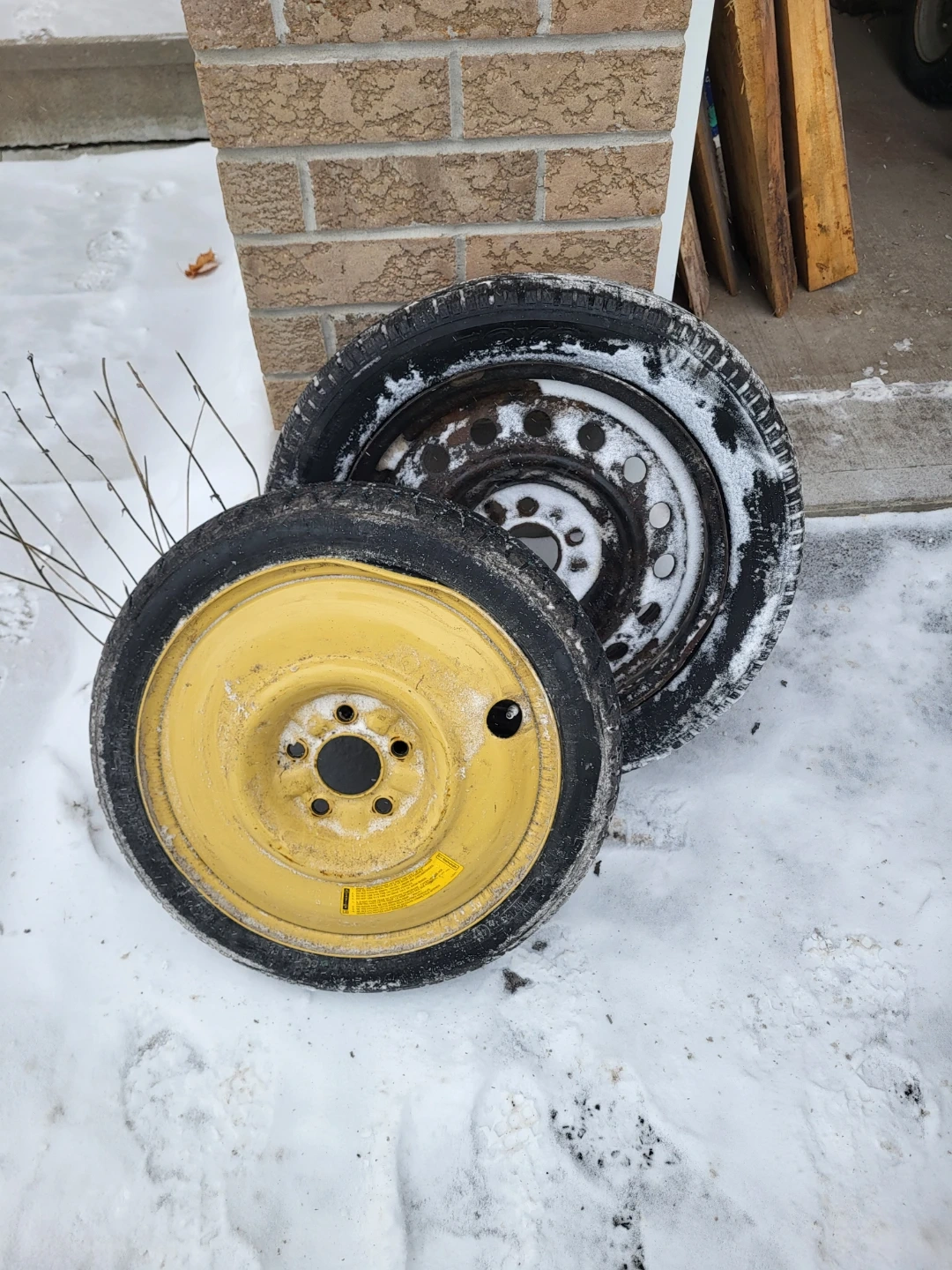 Two tires and rims. The tire is shot and the rims aren't the best. The spare tires not bad if you needed it in an emergency. Sold as is. Best for crafting and projects like a fire pit.