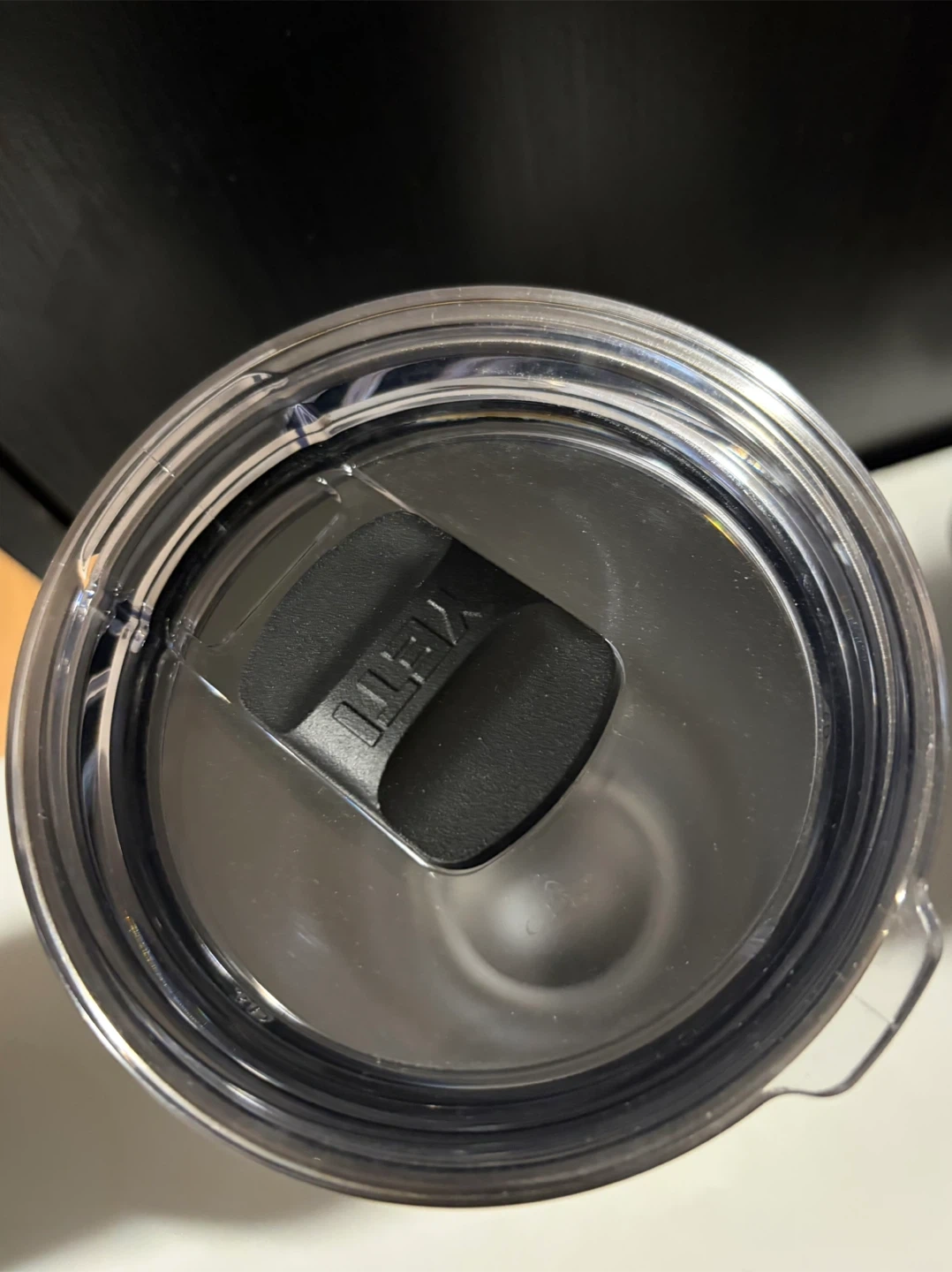 This is a navy Yeti tumbler. It's made with durable material to keep your drinks cold or hot. The lid is clear with a sliding closure.