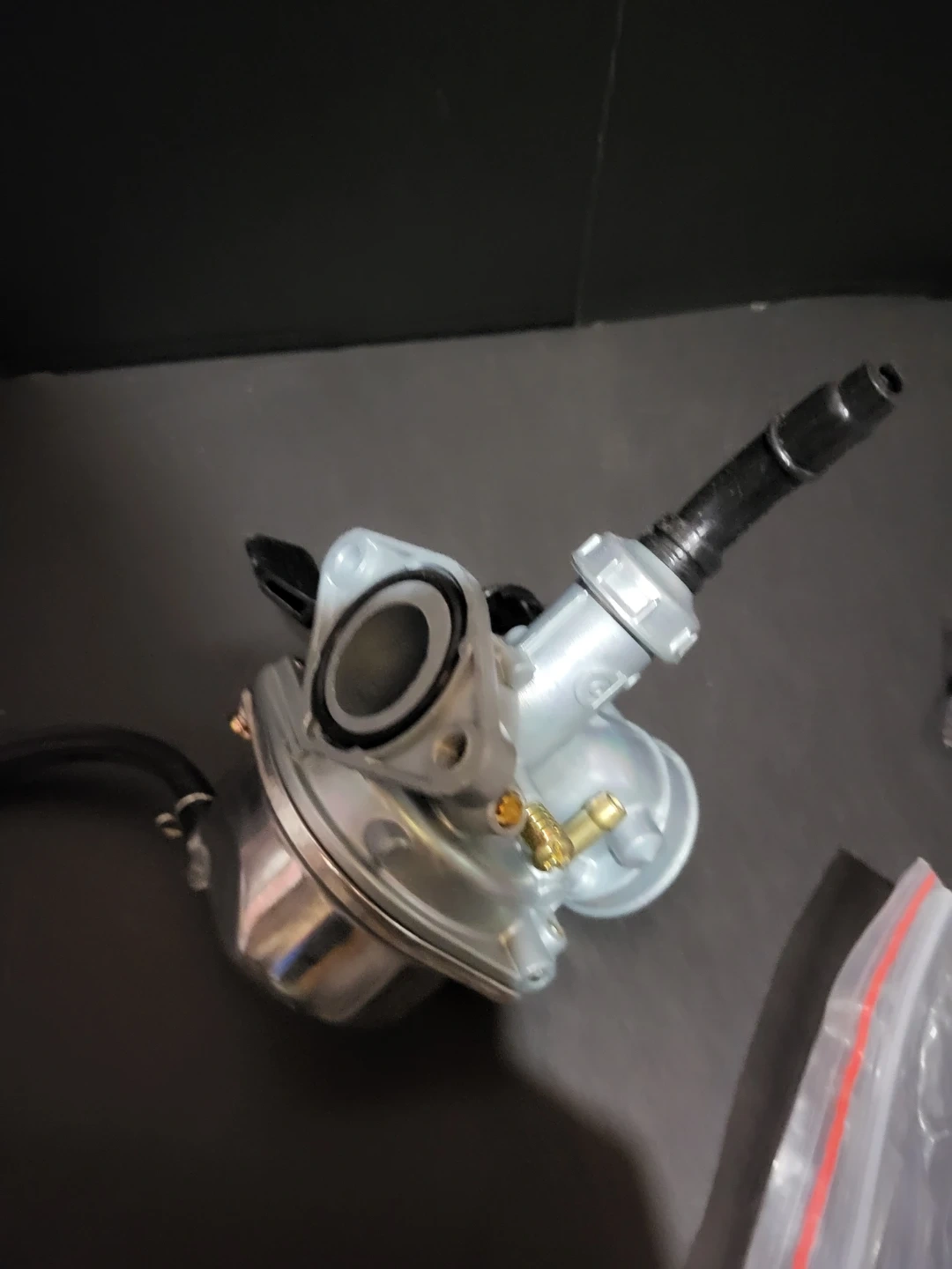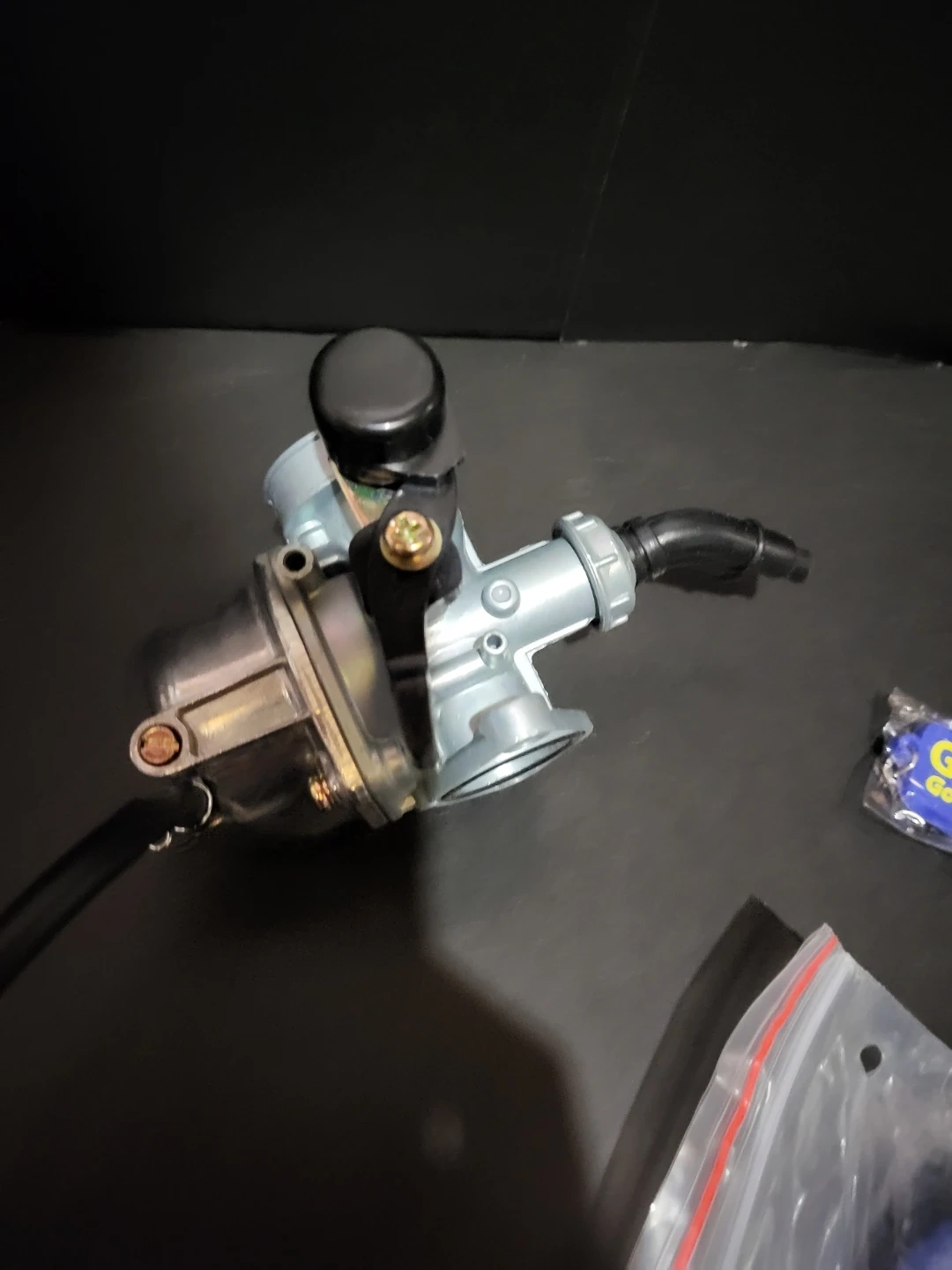 This is a carburetor kit. It includes a carburetor, an intake manifold, an air filter, and a fuel line with a filter. I had a 90 cc bike a while back to fix. Its long gone and I had lost this at the time so it was never used.