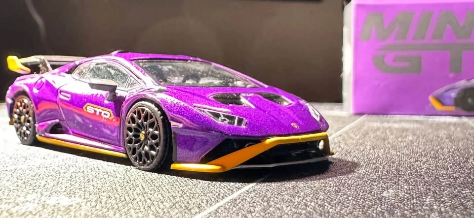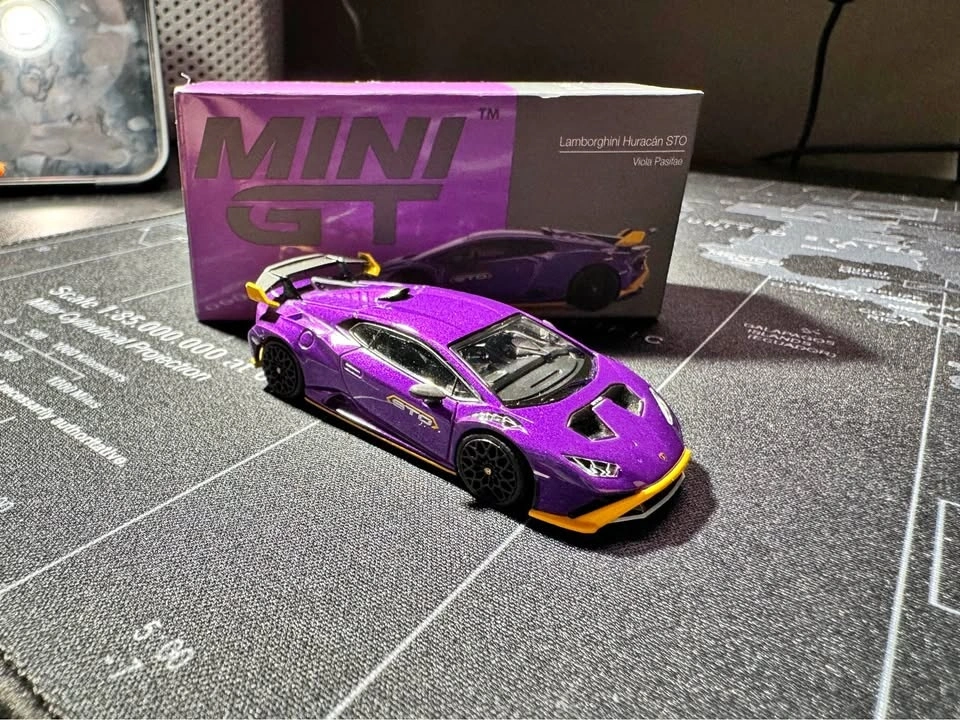 Selling a MINI GT Lamborghini Huracán STO in Viola Pasifae purple. 1:64 scale diecast model. Comes with original box. Very good condition, no visible damage. Displayed only, never played with. Authentic MINI GT release.