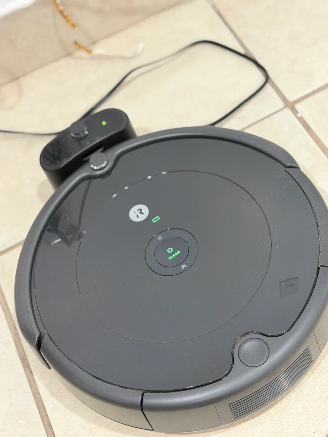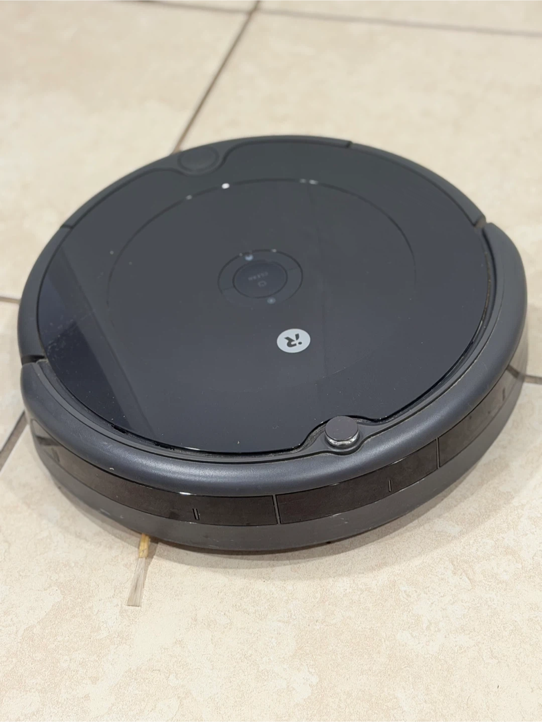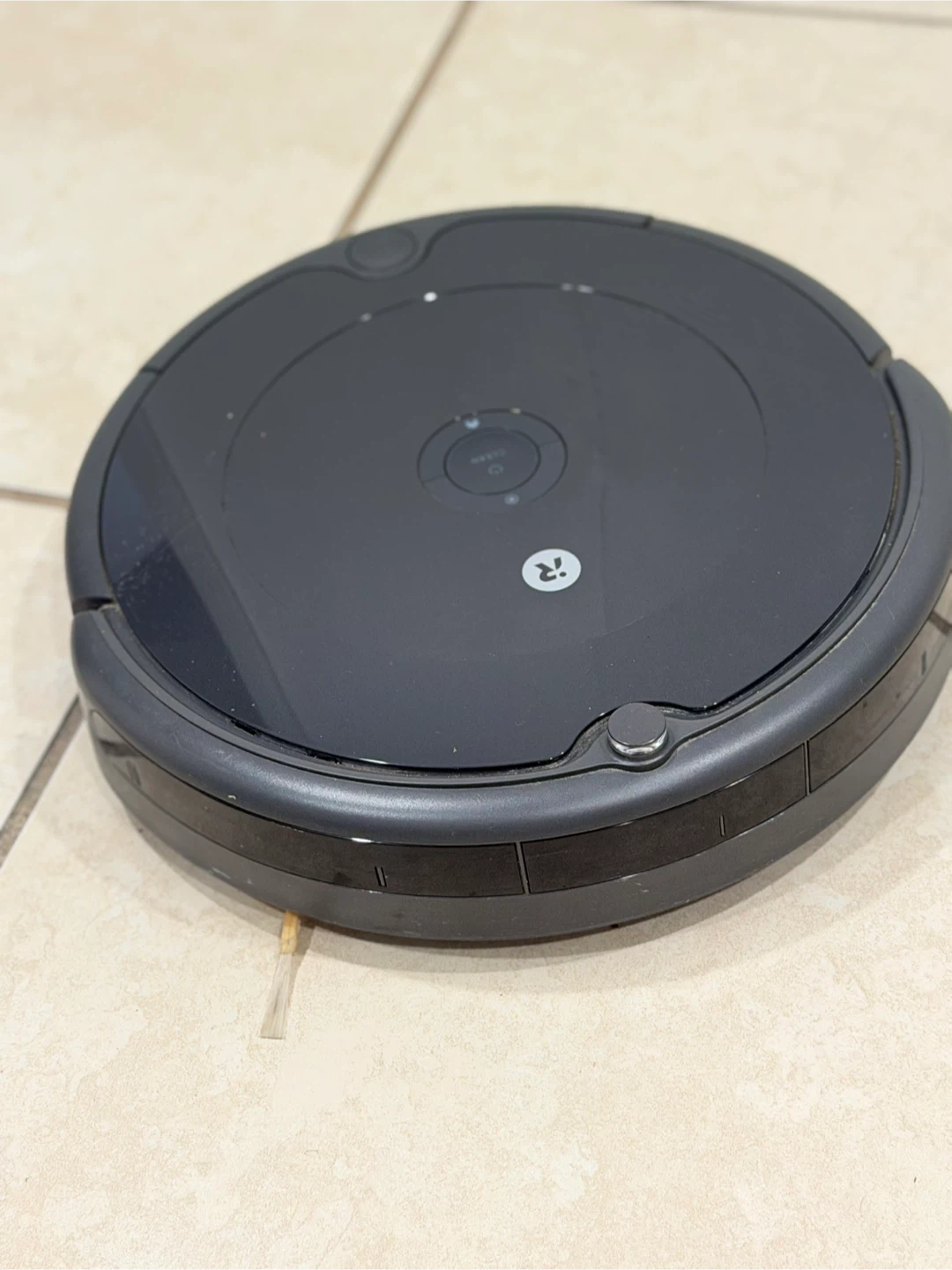 This iRobot Roomba 694 robot vacuum is black and features a 3-stage cleaning system. It's designed for cleaning floors. It includes a charging dock and power cord.