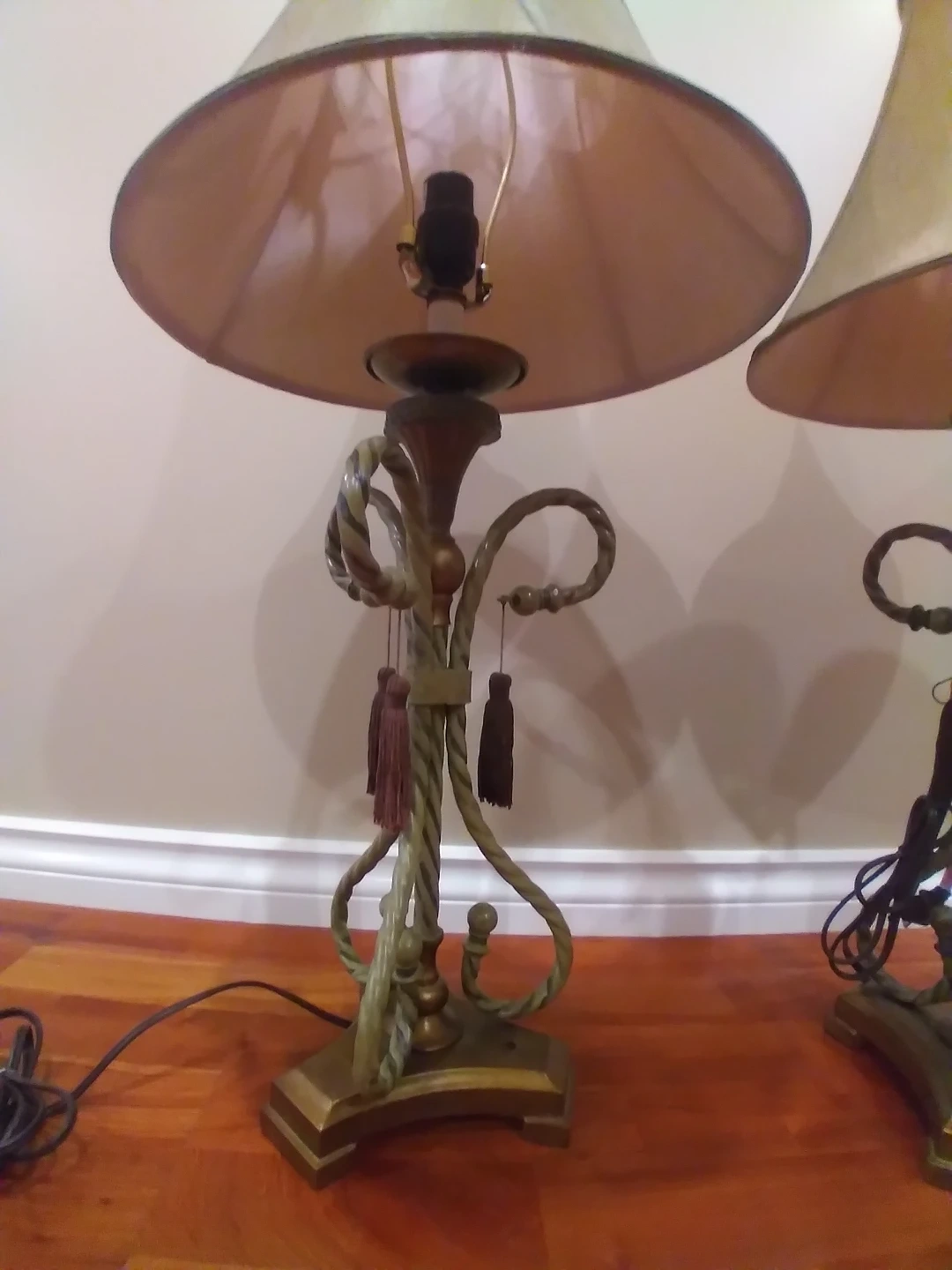 Set of two decorative table lamps. Each lamp features a twisted metal base with hanging tassels and a fabric shade. They'd add a nice touch to a living room or bedroom.