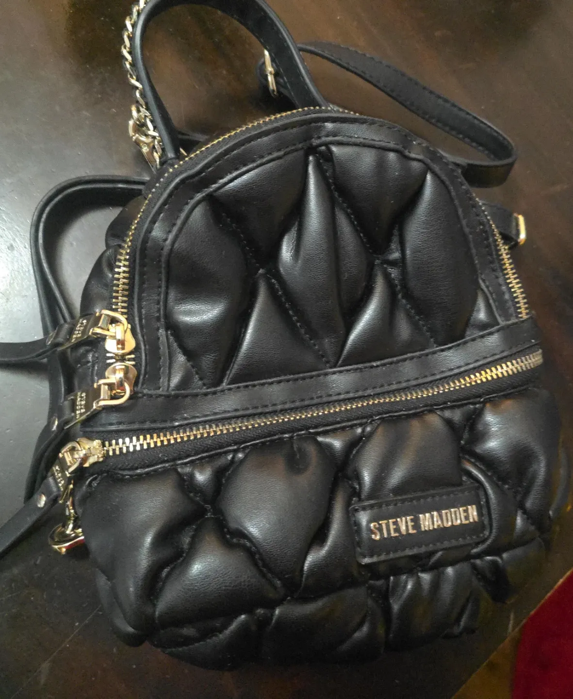 This is a black quilted backpack purse from Steve Madden. It's made of faux leather with gold-tone hardware and chain accents. Multiple zippered compartments for storage.