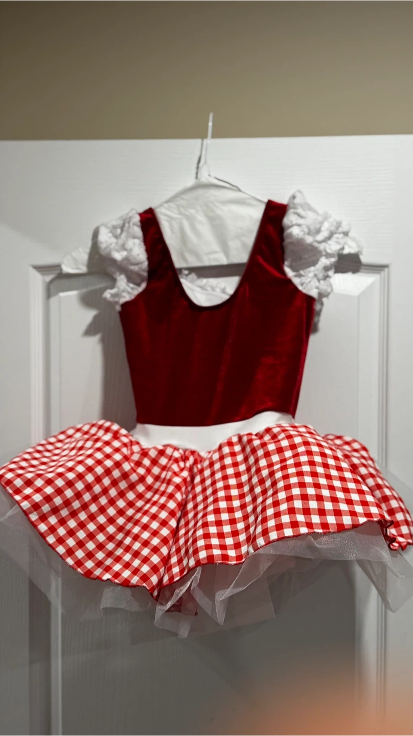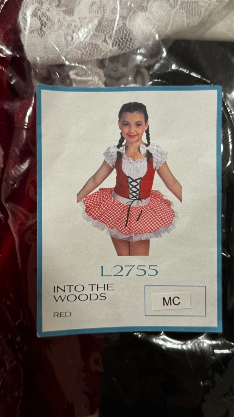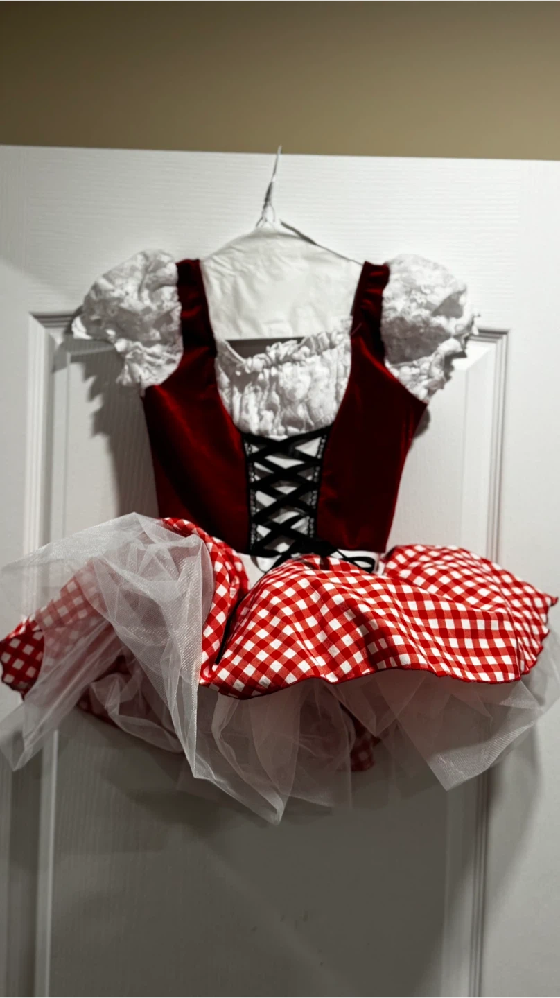 A "Into the Woods" costume in red, size MC. It features a red velvet bodice with lacing detail and a white ruffled neckline and sleeves. The skirt is a red and white gingham with layers of white tulle underneath. Perfect for dance or play!