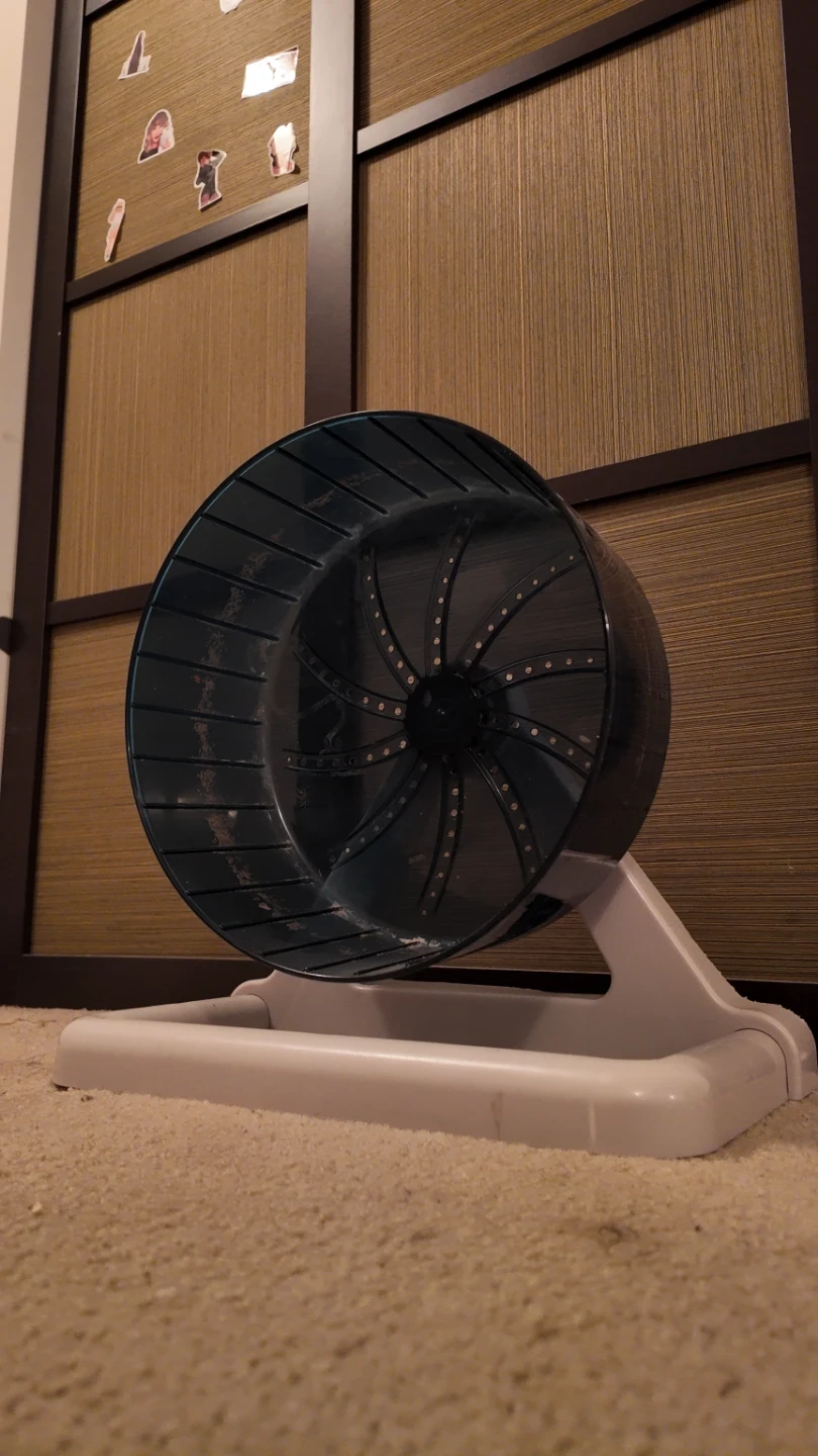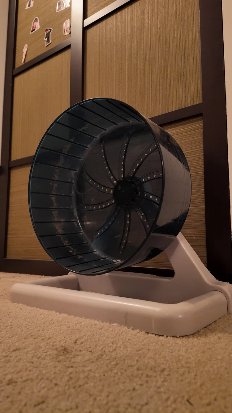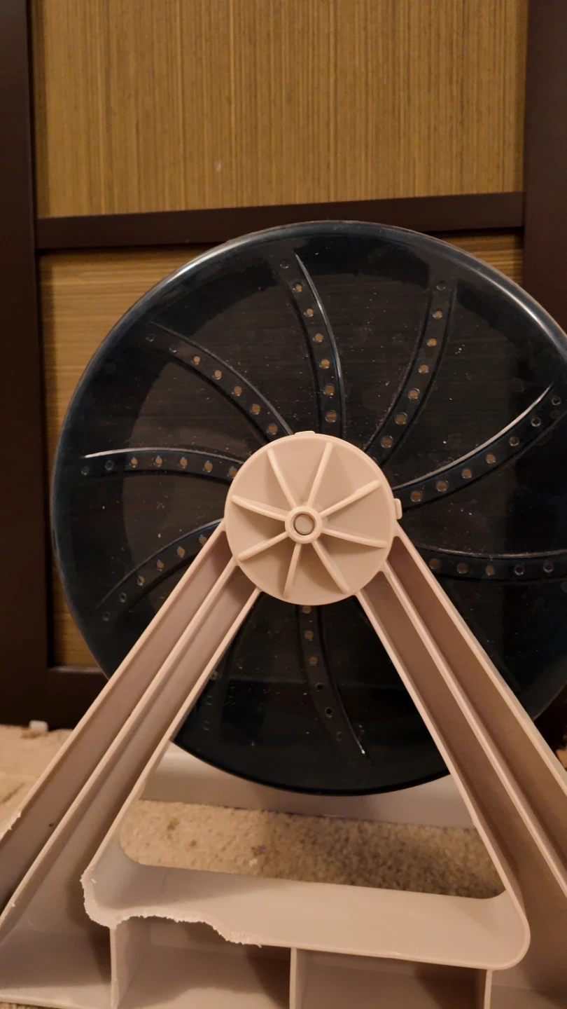 A dark teal exercise wheel for small pets like hamsters or gerbils. It's made of plastic with a sturdy beige stand. This wheel encourages activity and fun for your pet! It has minimal chews at the bottom, but works like new. Super quiet, and sturdy it was originally priced at $85, so it's very high end, only the best for your furry friend.