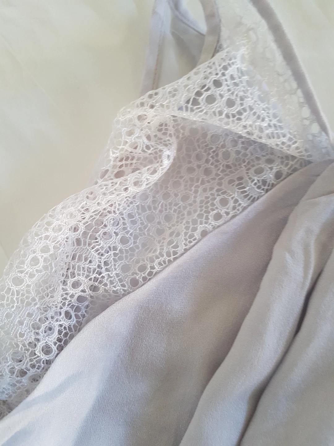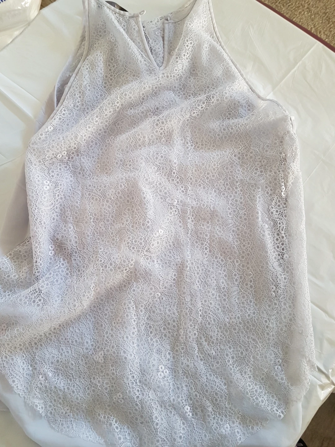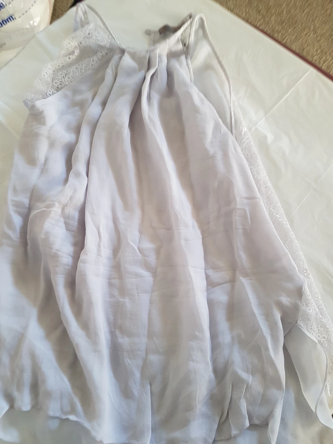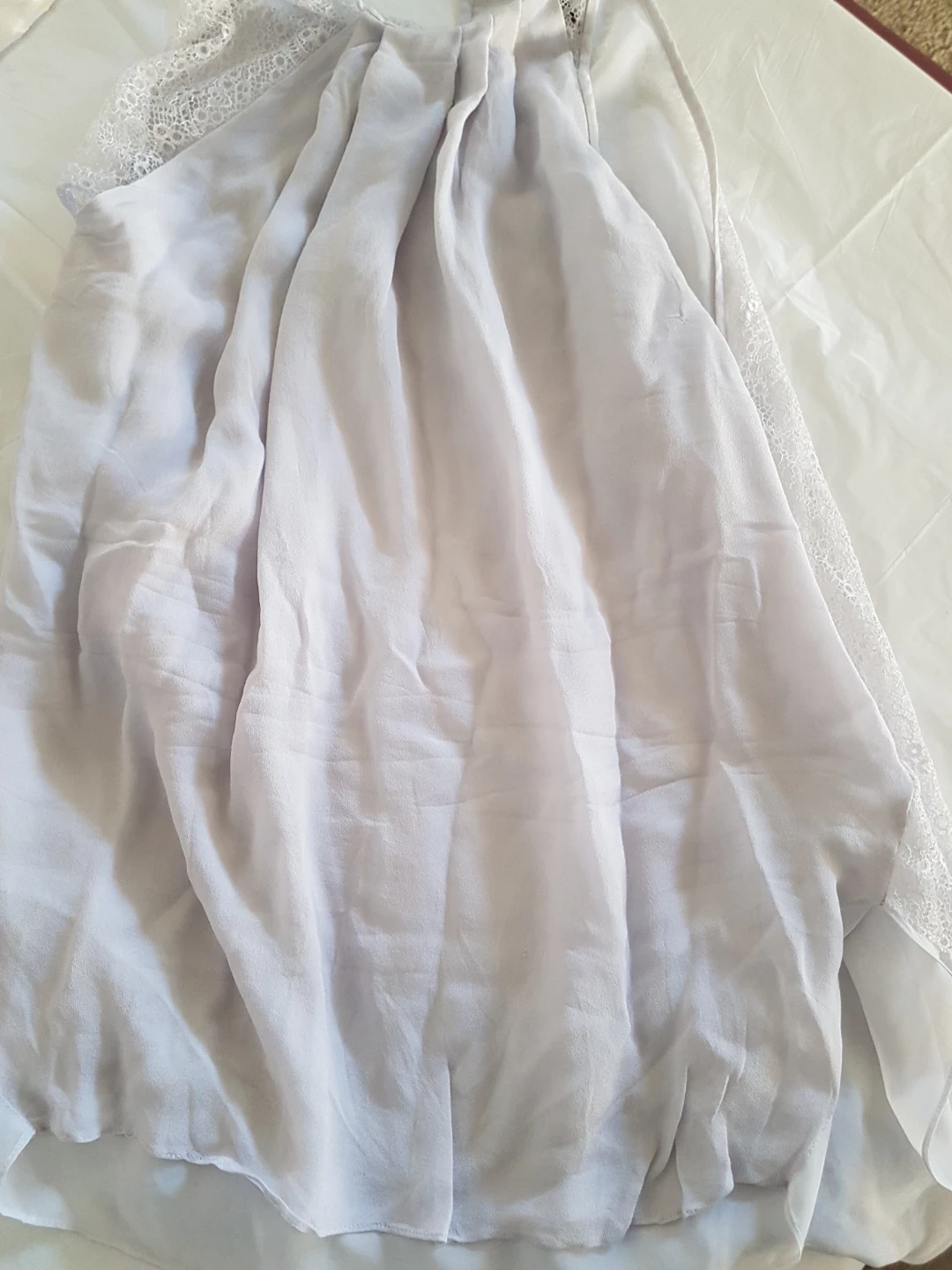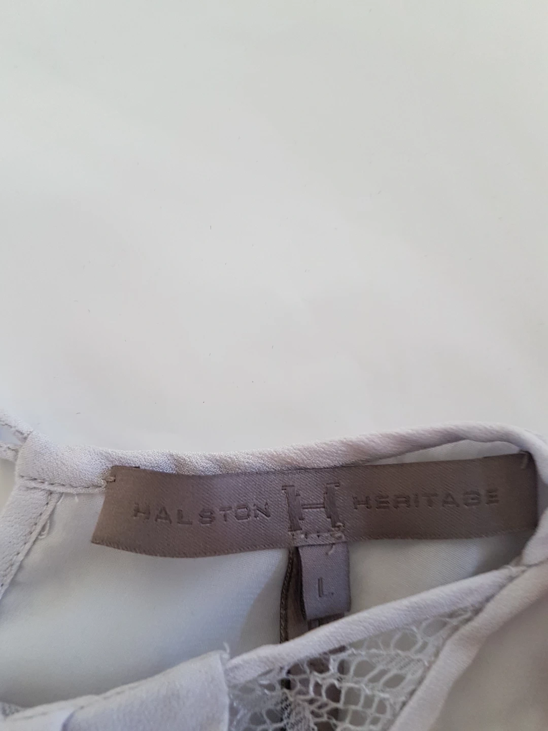 A lovely lavender tank top from Halston Heritage. It features delicate lace trim along the neckline and sides. Made from a lightweight fabric. Size is large.