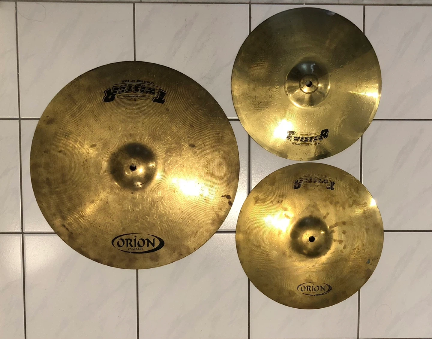 18” ride/crash (Orion) + 13” hi hat cymbals (Orion) with two stands.