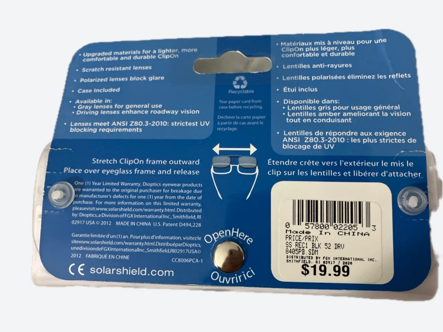 These Solar Shield clip-on sunglasses offer polarized lenses that block 100% UVA/UVB. They're scratch resistant and come in a grey lens colour. These are designed to fit over eyeglasses and meet ANSI Z80.3-2010 standards.