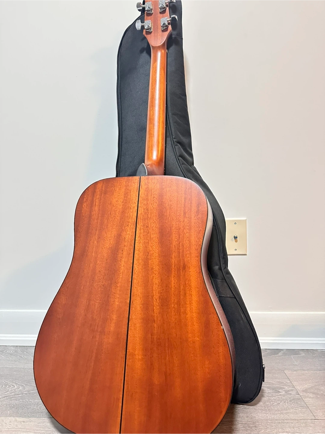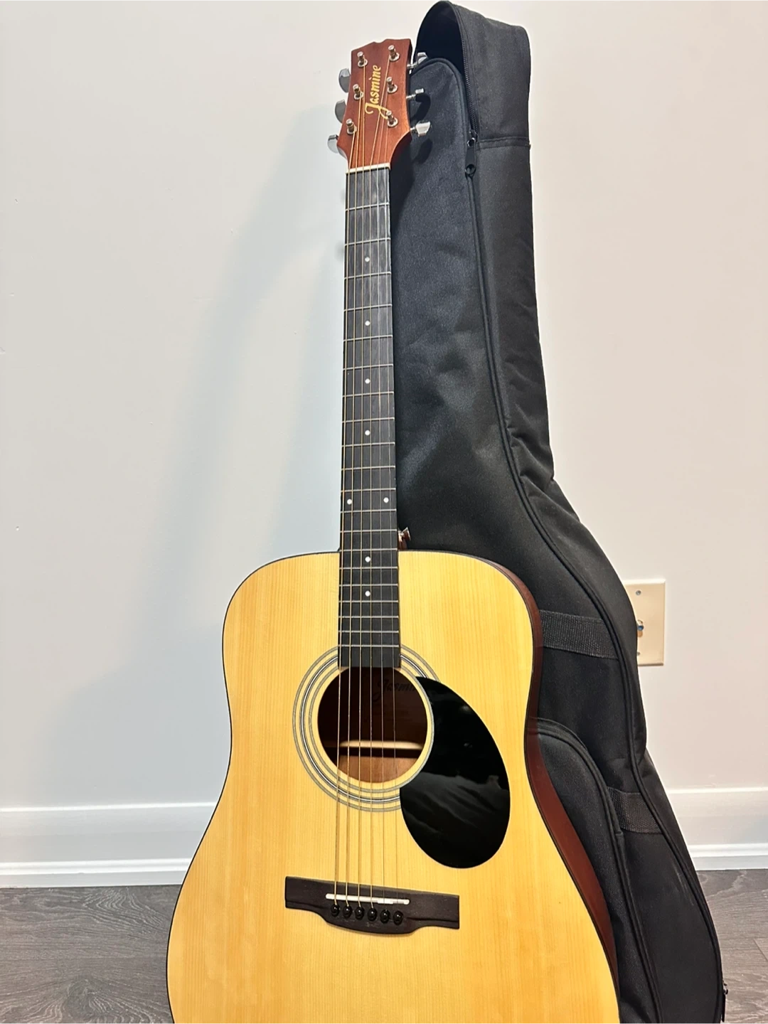 This is a Jasmine acoustic guitar. It comes with a black gig bag for easy transport and protection.