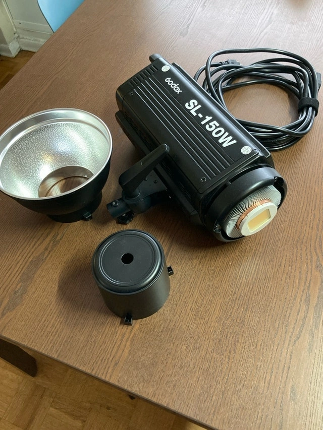 This 150W light offers stable and bright output. It's in good condition with minimal signs of wear. Includes the standard reflector and power cable.
