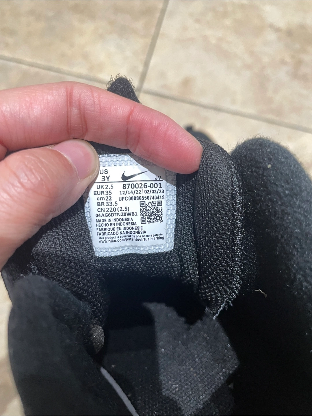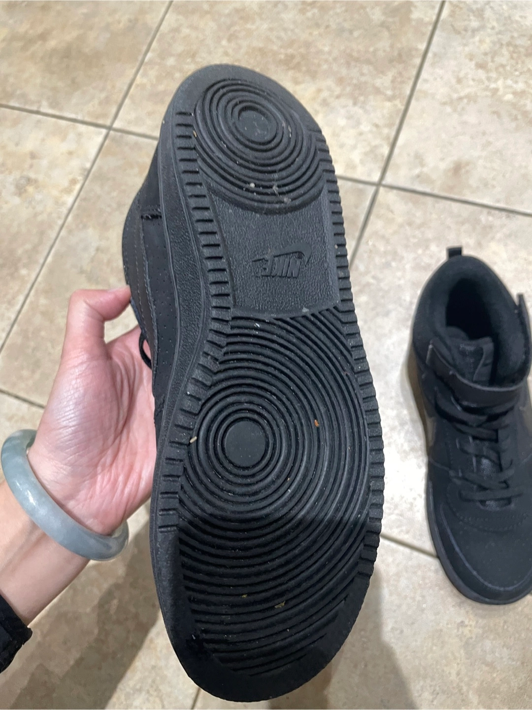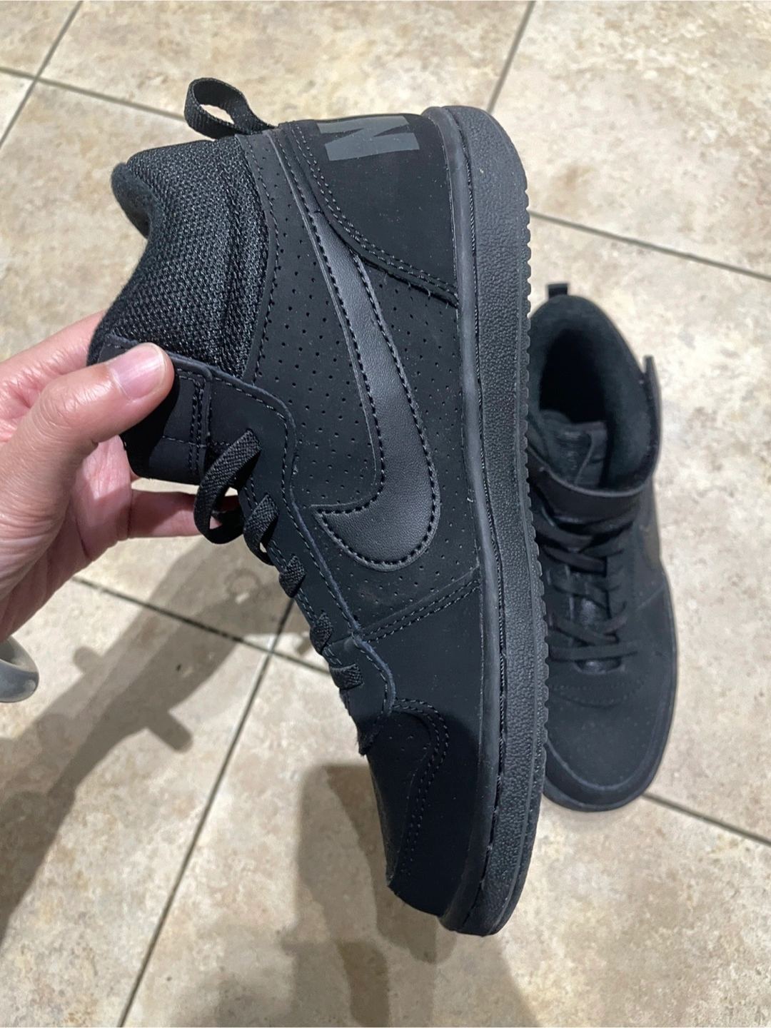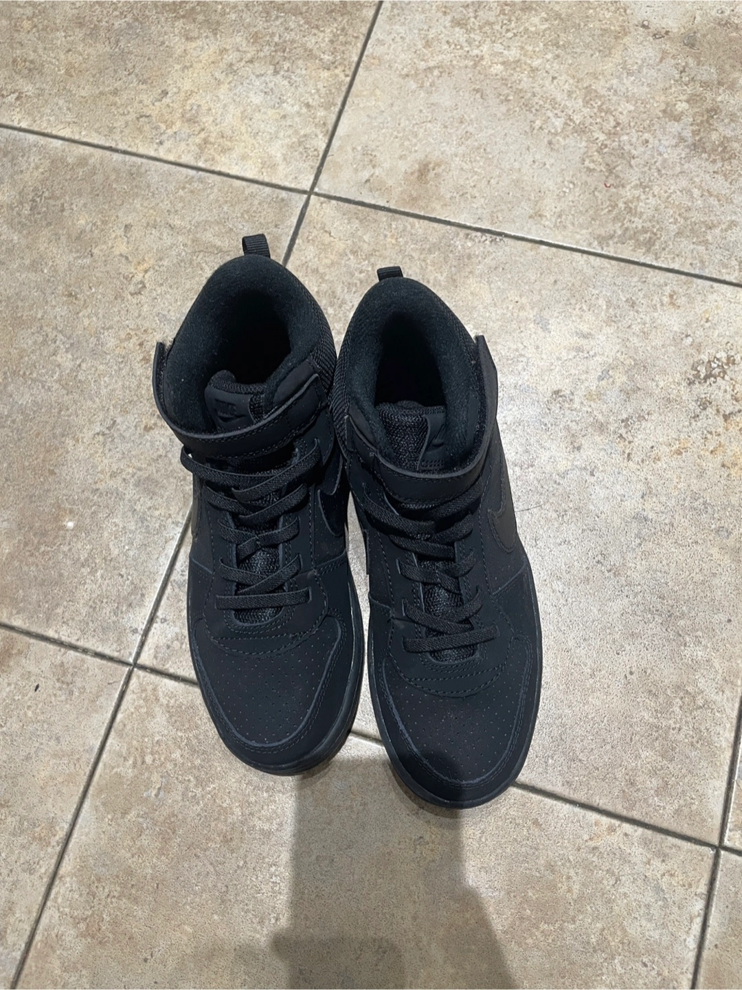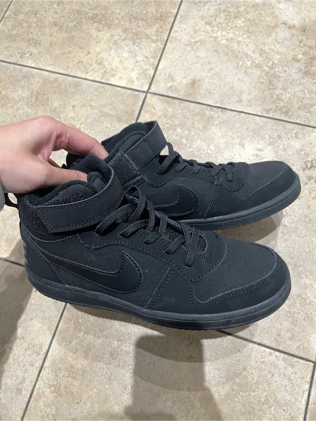 Black Nike Court Vision Mid high top sneakers. Size 3 Youth (US 3Y, UK 2.5, EUR 35, CM 22). These shoes have a Velcro strap closure over the laces. They're made of synthetic leather and rubber.