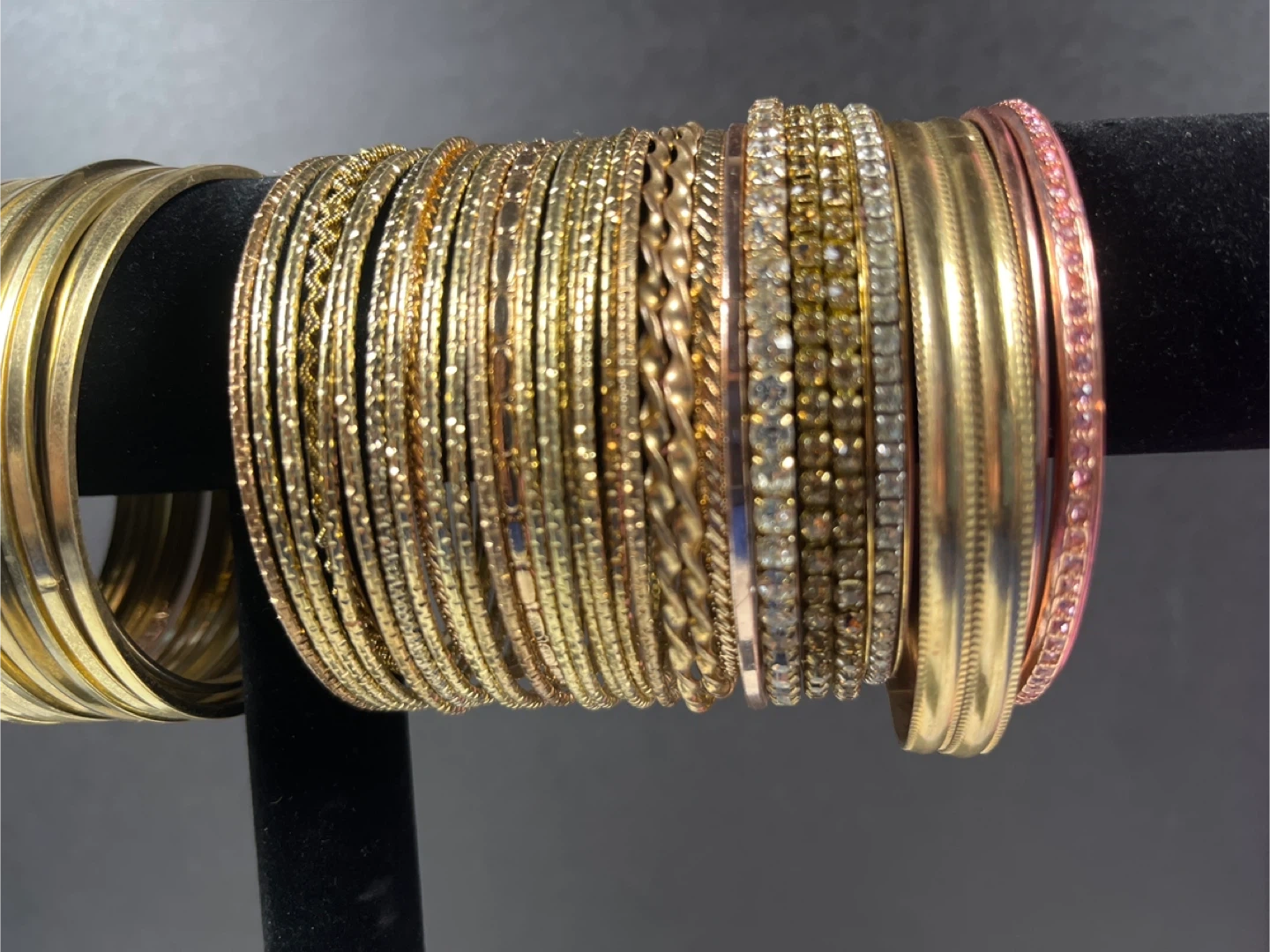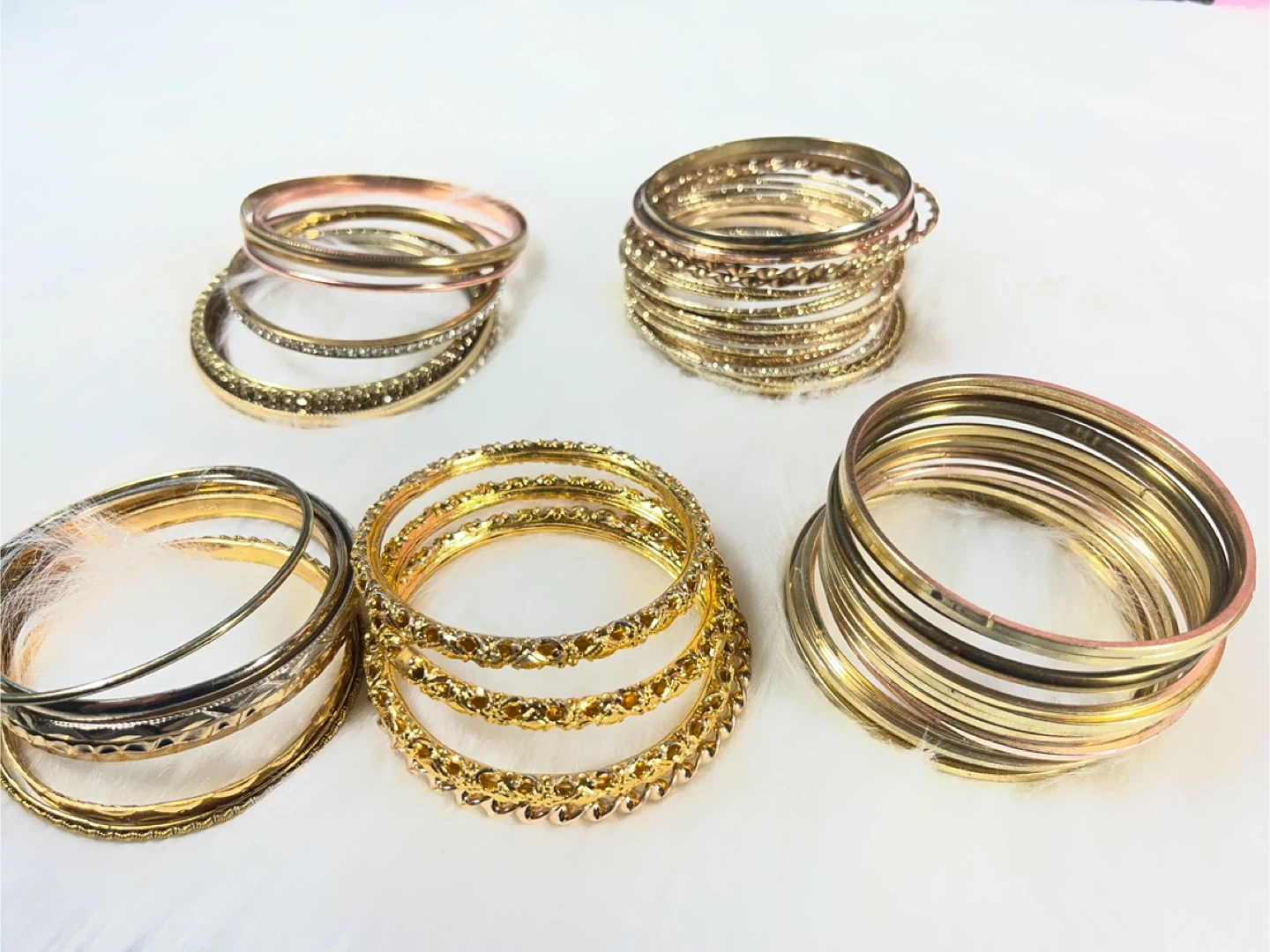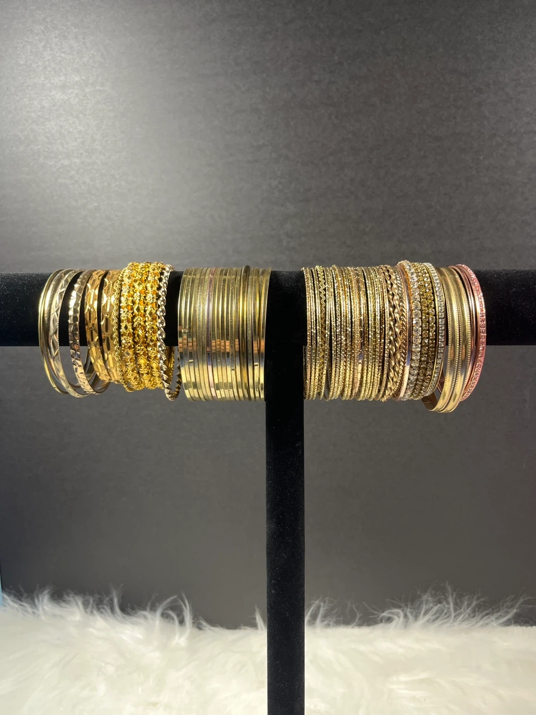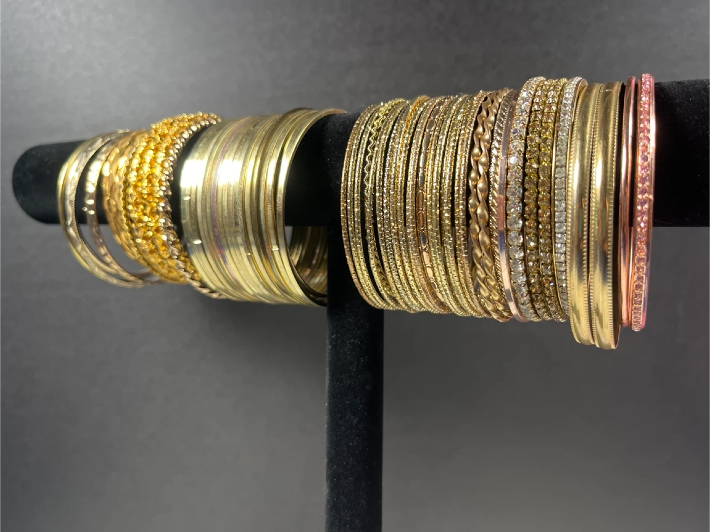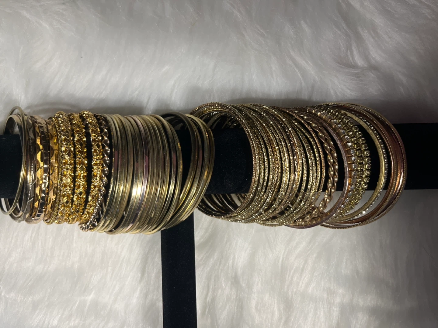 This is a set of 62 assorted bangles in various gold tones. It includes plain, textured, and jeweled designs. These bangles add a touch of sparkle to any outfit! ALL FOR $20